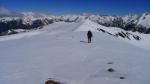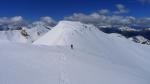 Girando un poco a la derecha (S) la larguísima arista vuelve a descender al collado de Castanesa (2685m. 4h09′) para subir al punto más alto de la excursión, el pico Castanesa (2858m. 4h45′). Buenas cornisas de nieve a nuestra izquierda nos hacen avanzar un poco desplazados hacia la ladera W, y quitarnos los crampones para calzar raquetas porque la nieve ya es blanda y profunda.