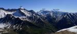 Tras un ligero descenso vuelvo a enfrentarme a la subida hasta la cota 1966m (1h48′). Otro colladito (1943m 1h50′) da paso a la pendiente final que me lleva al Toronzué (2263m 2h24′), con un mogote de nieve en su cumbre. Enfrente (N) tengo la sierra que va desde Sabocos a Tendeñera y, siguiendo hacia la derecha (NE y E) el valle de Ordesa con las cimas de Monte Perdido, Cotiella y Peña Montañesa.
