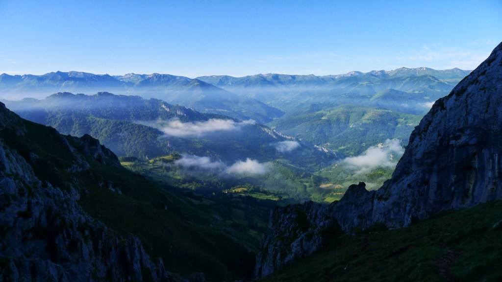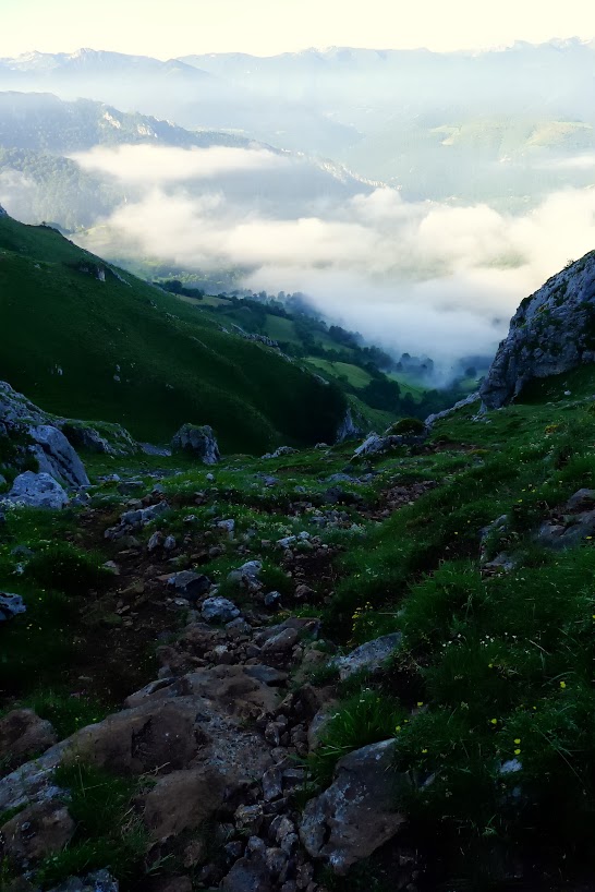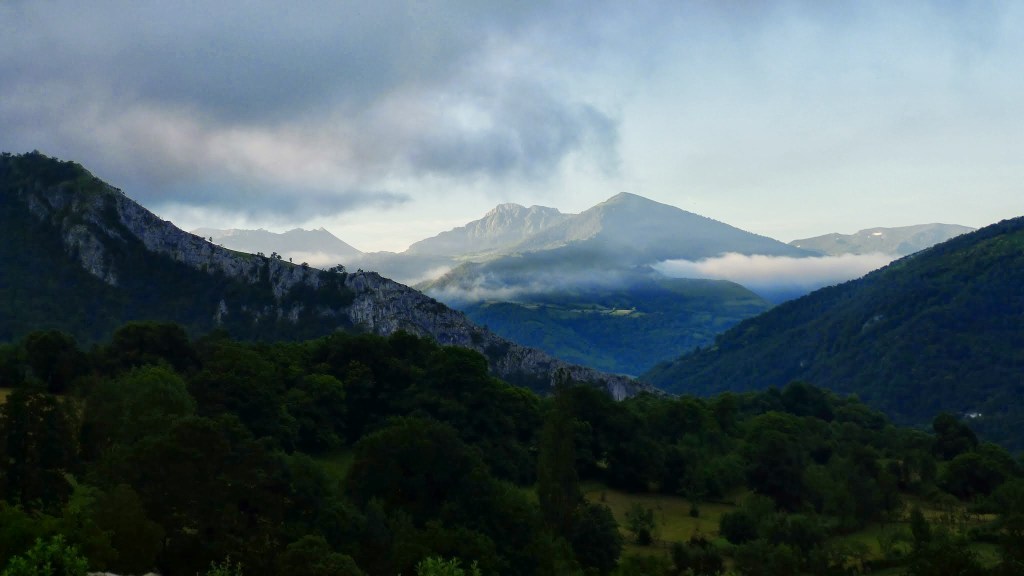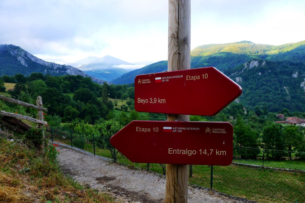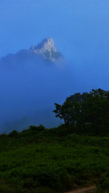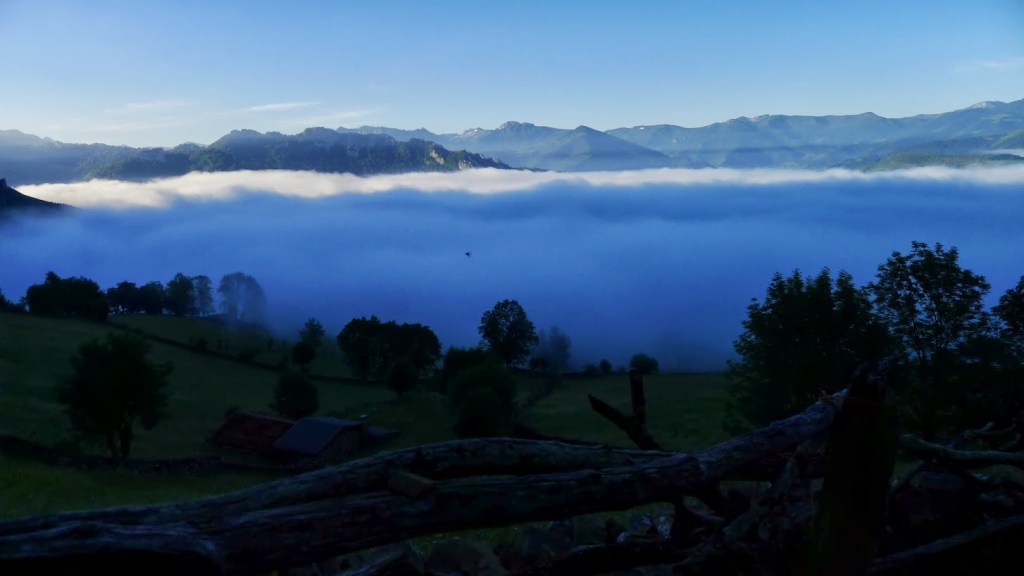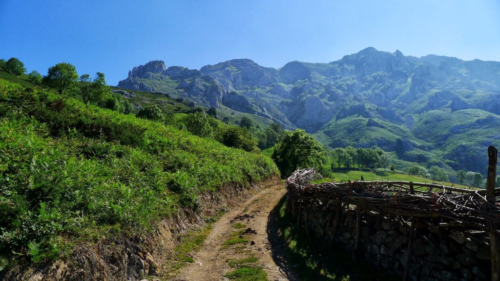 Hay que seguir hacia el E las marcas de GR y PR, también hay carteles indicadores, saliendo del pueblo por una pista que pasa junto a cabañas y prados de siega de hierba. Las agujas de la sierra de Pelúgano empiezan a vislumbrarse entre la niebla como figuras fantasmagóricas. La pista gira hacia el N y sigue en esa dirección formando parte del GR109 y del PR hasta un desvío (980m 0h50′) donde el GR sigue recto y el PR va a la derecha. Seguimos el PR (ENE), pasa junto a un abrevadero (1050m 1h00′) y dejamos a la derecha la última cabaña (1090m)