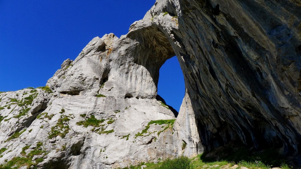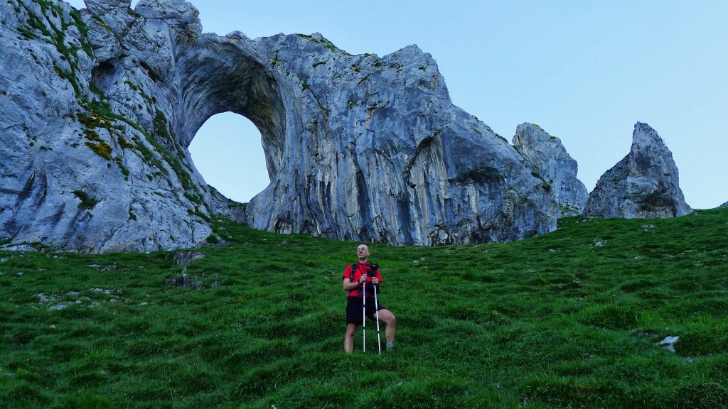 A partir de aquí la senda ya se introduce por terreno más abrupto, girando hacia el N y ascendiendo por una canal con algo de roca pero fundamentalmente herbosa. El camino es siempre bastante claro y siguen viéndose las señales amarilla y blanca de PR y flechas amarillas. Llegamos así a un imponente agujero en la roca caliza denominado Ojo de Buey (1230m 1h20′), donde nos despistamos un momento de la senda yéndonos hacia la derecha, cuando se debe pasar junto al Ojo y seguir siempre N. El sendero zigzaguea para superar la fuerte pendiente y llegar a un collado (1315m 1h37′).