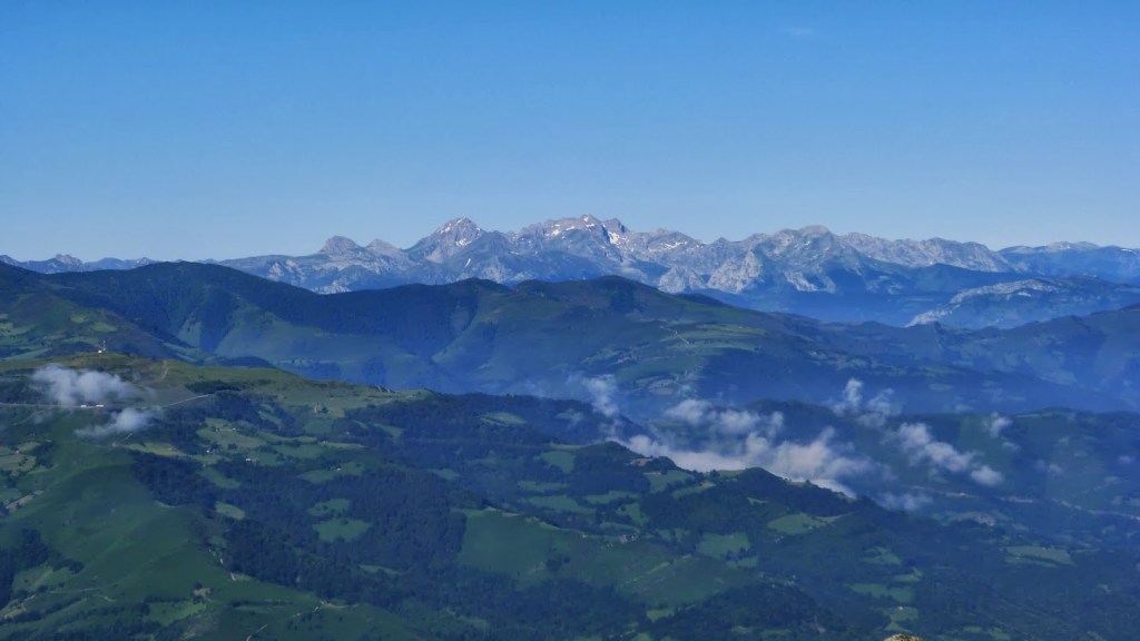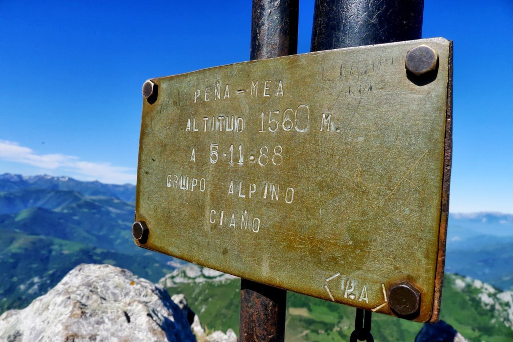 Se sigue un poco por la cresta, una zona con algo más de roca, algún paso hay que apoyar las manos, pero nos metemos después por una media ladera hacia el E por la cara S de Peña Mea , hasta volver a tomar la dirección N para afrontar el último tramo de fuerte pendiente, siempre con senda clara, que accede por terreno herboso a la cumbre (Peña Mea 1558m 2h05′). Hay una caseta cerrada con paneles solares y un pararrayos, vértice geodésico y un cartel indicador de la cima. Los jirones de niebla todavía se mantienen por las agrestes sierras que se despliegan al N.