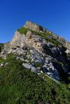 Se sigue por su base hacia la derecha, los extraplomos permiten su utilización como vivac. Tras un doble giro me encaramo por encima de la pared en una zona de vegetación arbustiva siguiendo hacia el E.