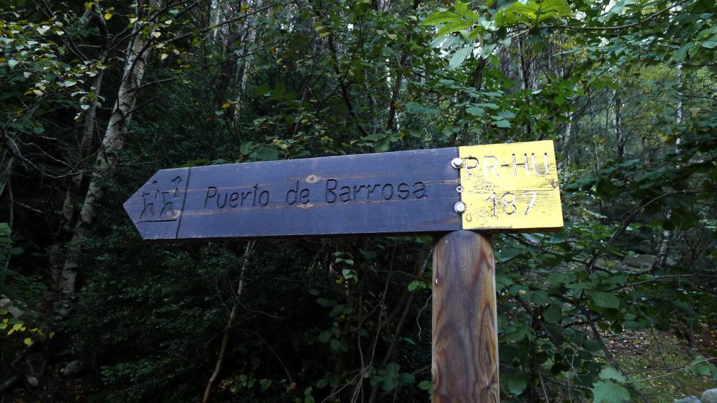 Comienza una ancha pista hacia el S que, tras dejar una primera desviación a la derecha, gira casi 180º (1395m 0h05′). Avanzo por bosque de pinos, abedules y serbales y varios paneles informativos nos recuerdan el pasado minero de la zona. La pista va girando poco a poco a la izquierda para ascender muy suavemente junto al río Barrosa. Finalmente se transforma en senda (1570m 0h25′).