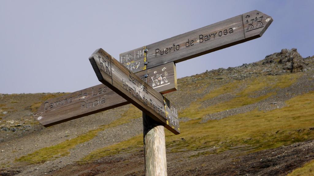 La senda sube con pendiente más fuerte, con algunos zig-zags, hacia el N, cruza un barranco (2075m 1h52′) y tras una curva a derecha y otra a izquierda comienza a ascender casi llaneando a media ladera (NW), atravesando varios pequeños barrancos que bajan de las paredes del pico Barrosa, hasta llegar a una zona donde se han acondicionado unos vivacs con muretes de piedras y hay un cartel que nos indica tres direcciones (2450m 2h35′).