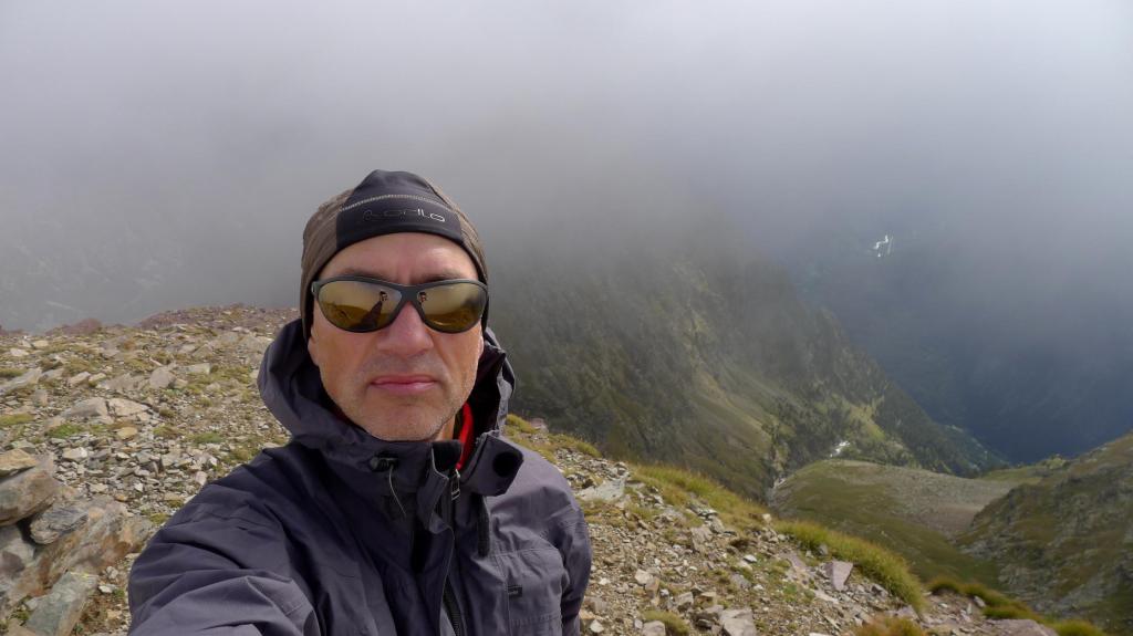 Sigo hacia el puerto de Barrosa, pero antes de llegar cambio claramente de dirección y voy hacia el E por prados y en sentido ascendente. Empiezo a perder visibilidad con la niebla. Al llegar a una pedrera pizarrosa subo por su derecha y encuentro una senda muy clara que sigue ascendiendo a media ladera, ESE, entre prados y cómodas pedreras pizarrosas. Finalmente alcanzo la cresta en el collado entre la cota 2732 y el pico Barrosa, al que ya se llega enseguida (pico Barrosa 2762m 3h10′). Paredones verticales caen hacia el N, hacia el circo de Pinarra, pero apenas puedo apreciar las vistas envuelto por la niebla. El descenso por el mismo camino.