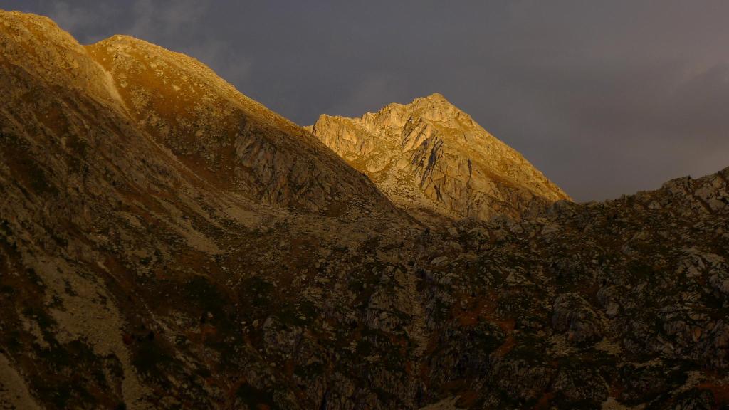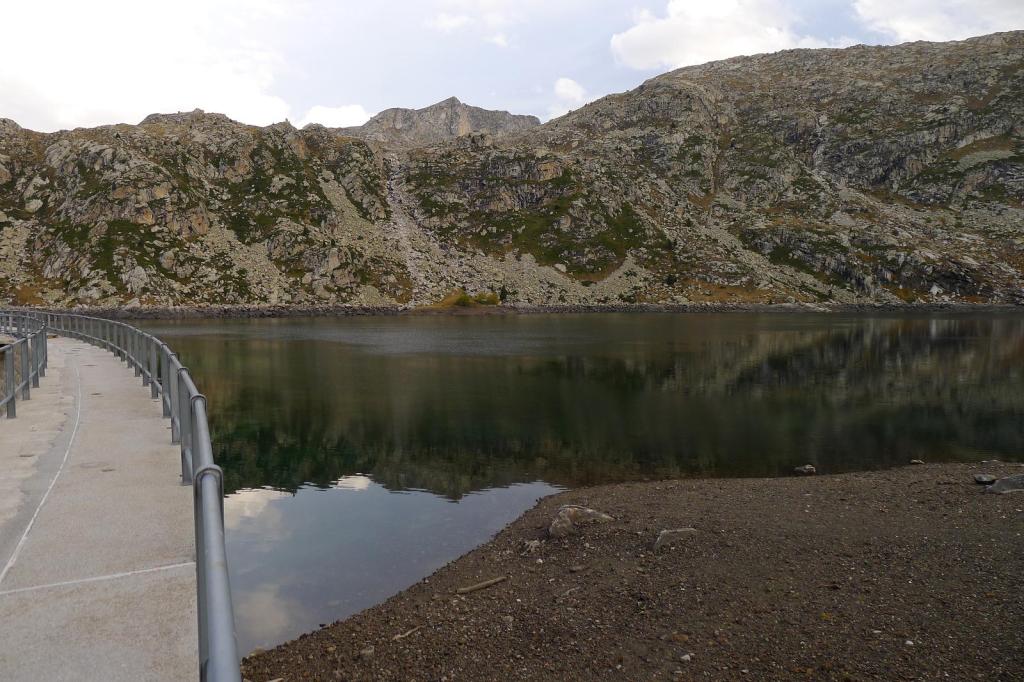 En la orilla E de la presa de Sallente (1770m) se toma una senda que zigzaguea cómodamente por una fuerte pendiente, siguiendo dirección E, hasta alcanzar una pista que corresponde a una antigua vía estrecha para los trabajos de la presa (Carrilet d’Estany Gento 2139m 0h43′). Seguimos dicha vía (NW y N) pasando por varios túneles (uno de ellos, más largo, se pasa mejor llevando un frontal), que nos lleva hasta la presa del Estany Gento (2140m 1h10′).