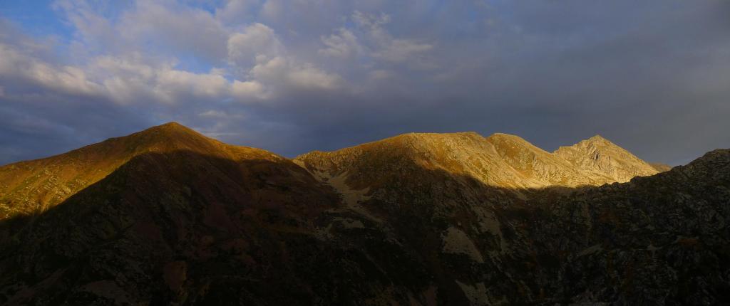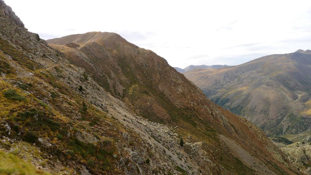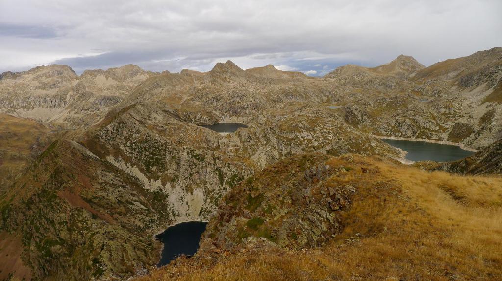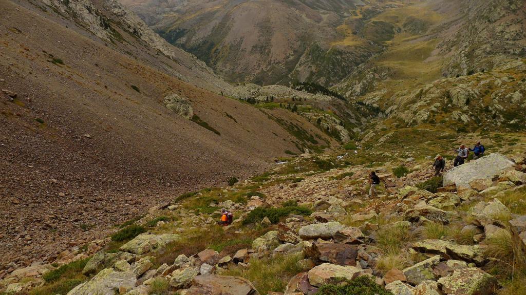 Continuamos rodeando el circo, ahora en dirección S y afrontamos una decidida subida hasta los últimos metros antes del collado. Yo me adelanto al grupo antes del collado para subir rápidamente el pic de l’Espada. (Col Font Sobirana 2447m 2h55′). Del collado al pico sólo hay unas fáciles palas de hierba (Pic de l’Espada 2547m 3h03′), pero la vista se amplía magnífica por incontables lagos.