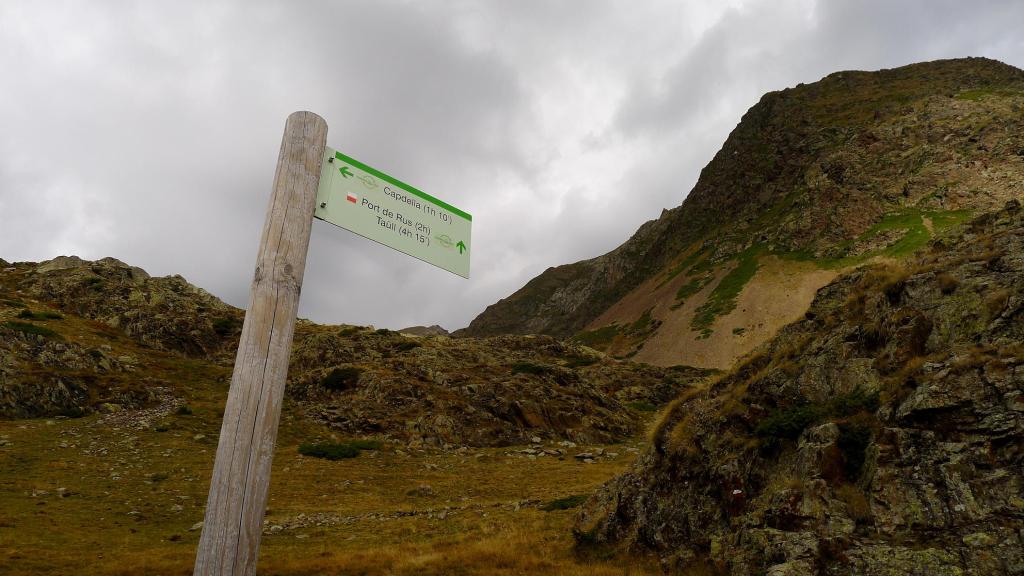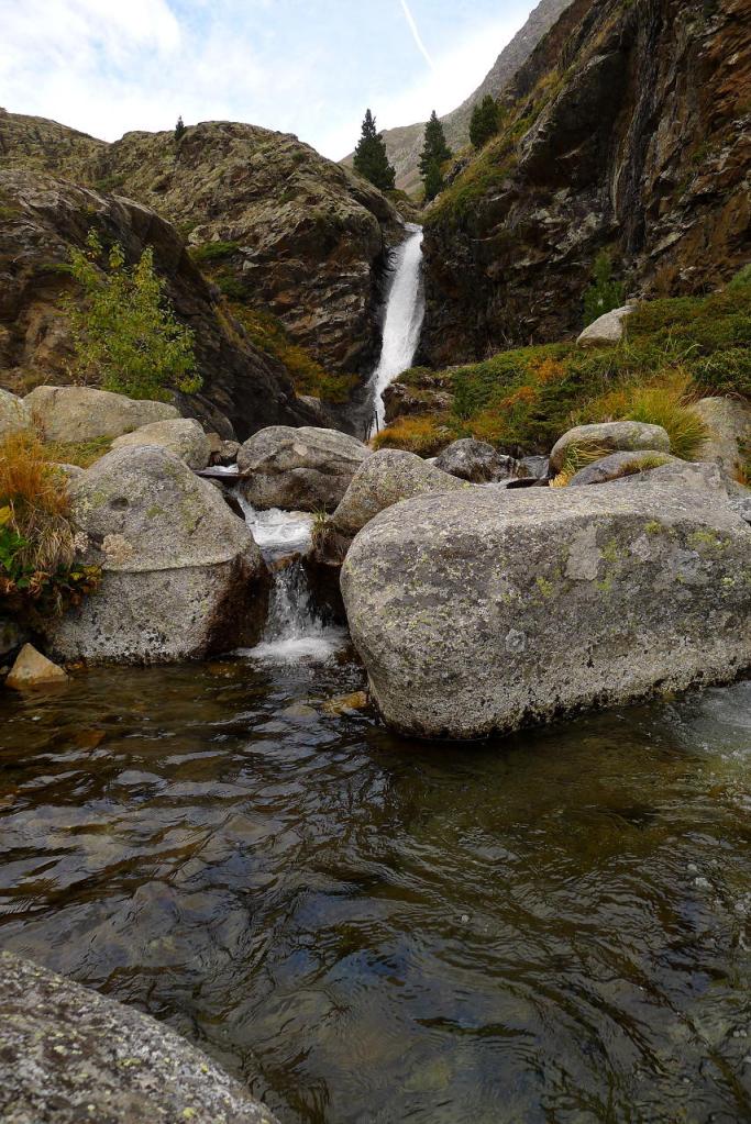 El descenso desde el collado en dirección NNW lleva a las cercanías del Estany Morera y después, girando al SW, por una fuerte pendiente al Estany Tapat, pasando por su desagüe subterráneo. (Estany Tapat 2170m 3h50′). Unos metros más abajo, de repente, aparece el agua procedente del lago y forma, junto con el barranco de Francí, el riu de Riquerna. Avanzamos por su orilla derecha.