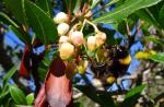 El tramo acondicionado es corto (fin de tramo acondicionado 550m 1h06′), empezando una senda con más pendiente y más pedregosa, pero que luego discurre más llana y cómoda a la sombra de una pared rocosa. En cuant a la vegetación empizan a predominar las encinas, las coscojas y los pinos, pero tmabién hay unos cuantos madroños con sus frutos ya maduros.