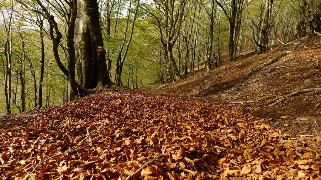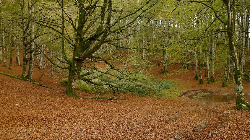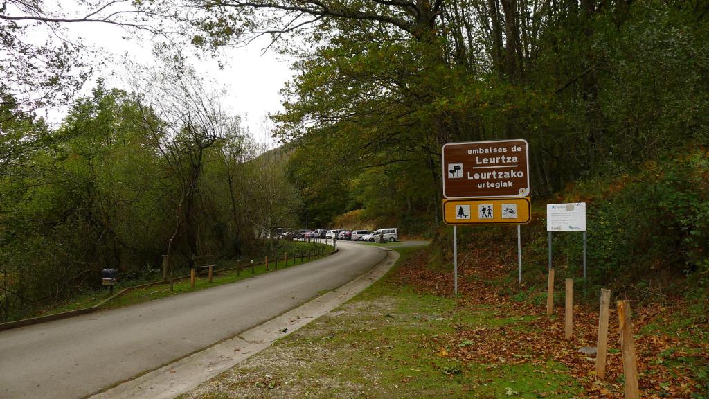 La carretera termina en la primera presa de Leurtza (670m) y hay que pagar 2 euros por el aparcamiento. A la derecha sale un camino (N y NW) que asciende por el hayedo. Hay un cerrado giro a la derecha (835m 0h25′) y luego otro a la izquierda (906m 0h38′) donde ya salimos del bosque y nos lleva hacia el collado por una senda a media ladera.