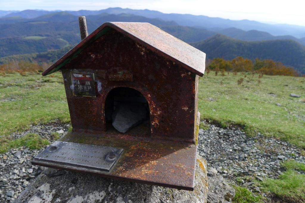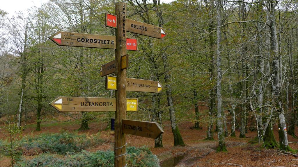 En el collado de Bonazorrós (975m 0h57′) la vista se abre y el viento es fresco e incómodo. Seguimos la cresta (SW) por cómodos pastos hasta el Soratxipi (1069m 1h38′), el punto culminante de la excursión. Aún hay que seguir un poco la misma dirección para luego girar a la izquierda descendiendo por un suave lomo (S) que, por bosque poco denso, nos conduce a un colladito en que conectamos con el GR12 (899m 2h10′). A los lados del camino encontramos puestos de caza de palomas, pequeñas casetas sobre una elevada plataforma.