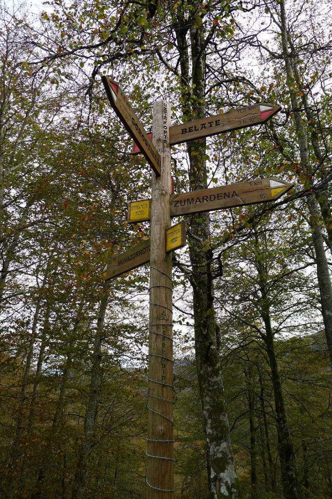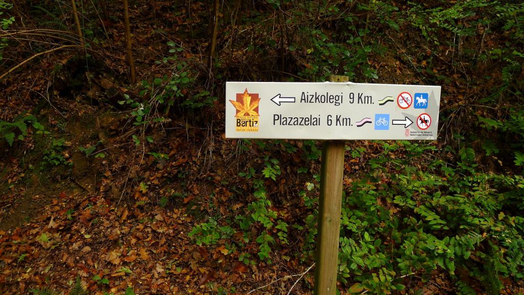 Nuestra segunda excursión se desarrolla por el Señorío de Bertiz. Propiedad privada de la que se tienen referencias desde el S. XIV Pasó a ser de la Diputación Foral en 1949 y declarado Parque Natural en 1984. Una amplia zona de aparcamiento con un edificio de información y otros servicios es lo primero que encontramos. Al fondo está la entrada que da acceso a diversos caminos con un panel en el que un mapa indica los recorridos señalizados con diferentes colores. Escogemos el de color verde que sube hasta la cima de Aizcolegi para descender por el de color rosa haciendo así un recorrido circular bastante largo pero con un desnivel moderado.
