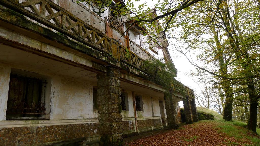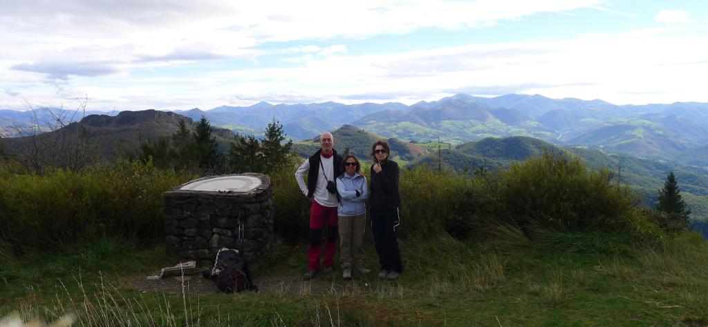 No hay ninguna reseña destacable, sólo seguir la amplia pista, siempre metidos en el bosque. Llegamos a la bifurcación de los dos recorridos (410m 3h04′) y únicamente Esmeralda, Pili Mainar y yo decidimos ascender al Aizkolegi, mientras el resto del grupo va comenzando el descenso por el recorrido rosa denominado Plazazelai. Una magnífica decisión subir porque en la cima encontramos un precioso palacio en ruinas, el palacio de Aizkolegi (825m 3h20′), tenemos magníficas vistas ya que estamos por encima del nivel del bosque y me imagino la buena vida de sus habitantes en los tiempos de esplendor.