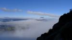 En la anterior entrada de Oturia se describe el recorrido desde Isún de Basa (983m) hasta los llanos de la Lera (1600m 0h58′) y el pie de la cumbre, después de pasar junto a los carteles del PR5 (1600m 1h19′) por donde luego bajaré. Subir a esta cima directamente no tiene ninguna dificultad, salvo andar por praderas empinadas y algo de piedra. Aun quedan restos de nubosidad que tapan las cumbres pirenaicas y el viento es muy frío (cima de Oturia 1921m 1h50′) . Aprovecho los neveros para descender rápidamente.