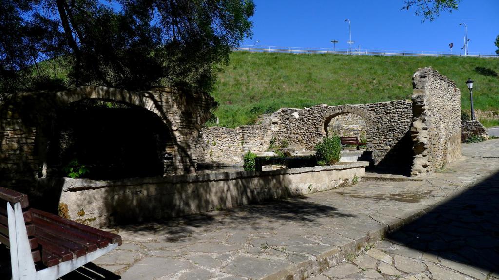 Aparcamos el coche junto a la empresa de guías de Aragón Aventura, pero inicio la descripción desde la pista de hielo (790m.). Cruzamos a la otra acera y nos desviamos a la derecha para pasar bajo la carretera antes de la rotonda. A nuestra izquierda quedan las instalaciones de las Escuelas Pías, después, a la derecha, el lavadero y la fuente, y luego cruzamos el puente sobre el río Gas (775m 0h08′). Seguimos por la carretera que va al camping, a la derecha están las pistas de tenis. Se pasa también sobre el barranco de Acín y nos desviamos por una pista a la izquierda, pero igualmente se puede seguir la carretera.