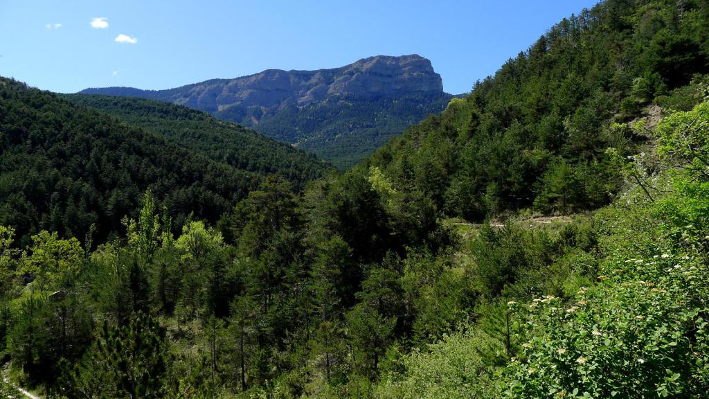 La pista desemboca en una bifurcación (815m 0h26′), a la derecha se va al camping, nosotros seguimos por la izquierda (balizas de PR). Después el PR también se divide en dos, a la derecha Mondaín, a la izquierda San Salvador, nosotros seguimos ésta última dirección. Terminamos de ir por pista y comenzamos senda (940m), siendo, a partir de aquí un recorrido mucho más agradable y sombreado que se introduce por el barranco entre el cerro Mondaín y el monte Solaneta, por pinos, encinas y bojes.