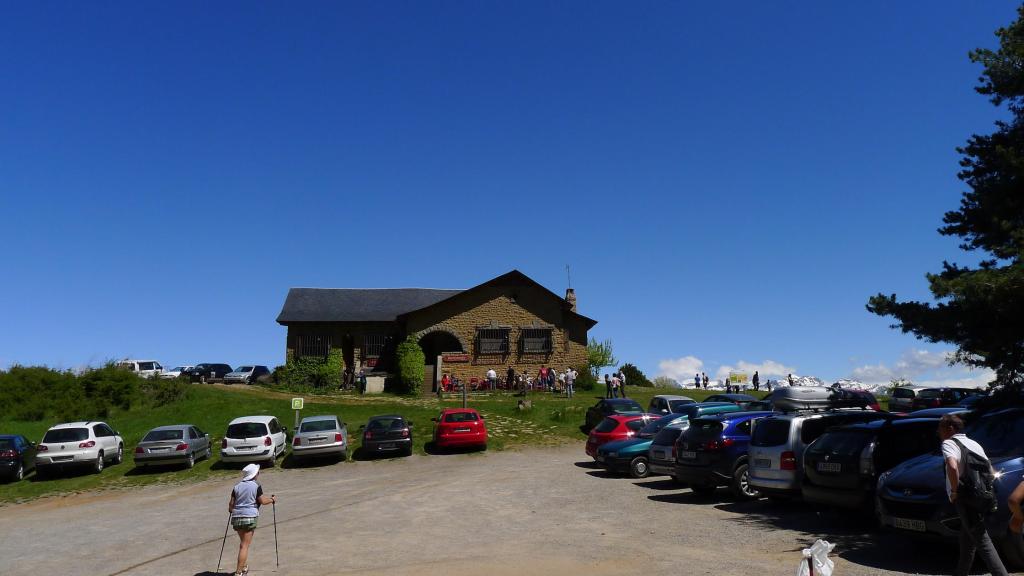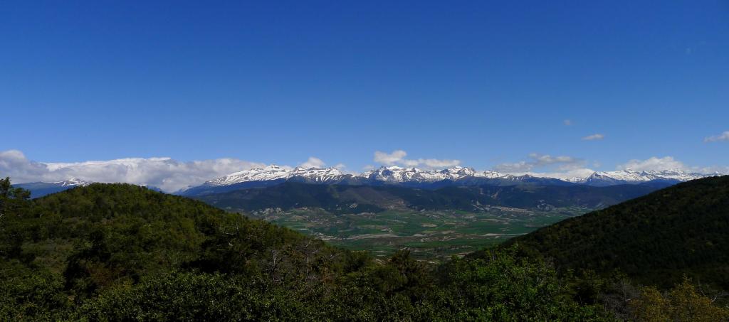 Se atraviesa el barranco por una pasarela (940m 1h00′) y a la altura de la ermita de San Salvador (que no vemos) se divide la senda en dos (1007m 1h10′); seguimos las marcas de pintura del PR, pero da igual seguir la senda de la izquierda. Más arriba se llega a un claro y se cruza una pista (1142m 1h26′) y enseguida alcanzamos la carretera (1162m 1h29′) que tomamos a la izquierda para llegar al refugio mirador de Oroel (1186m 1h33′), con un montón de gente que ha llegado en coche y donde descansamos sentados en la terraza trasera con las vistas al Pirineo.