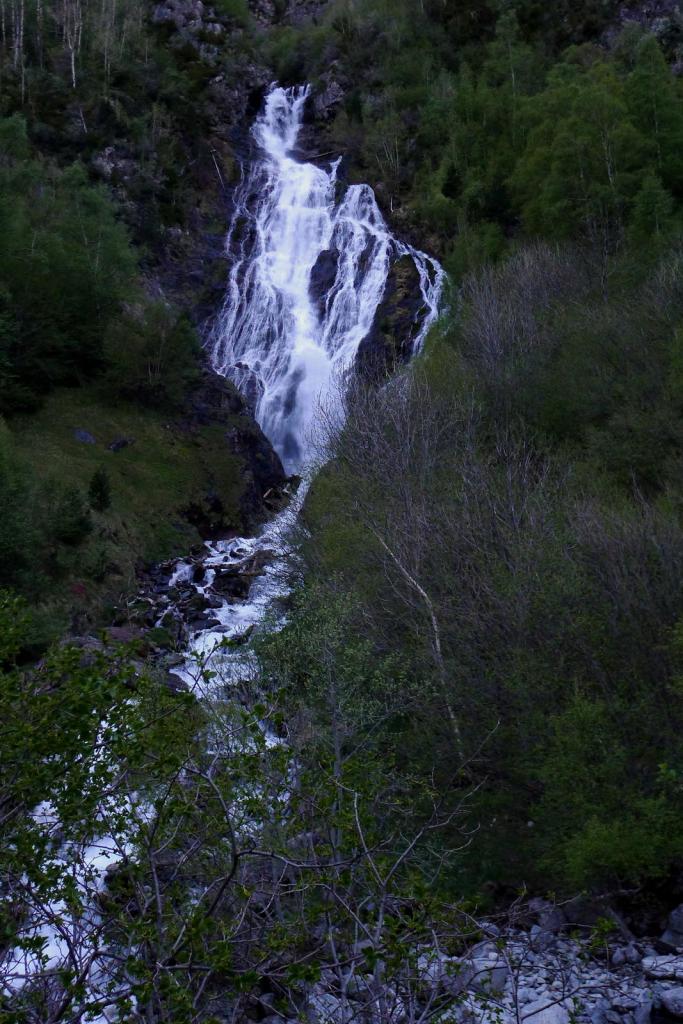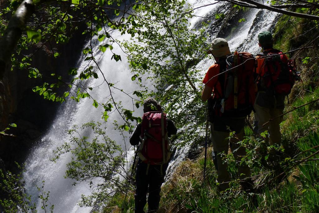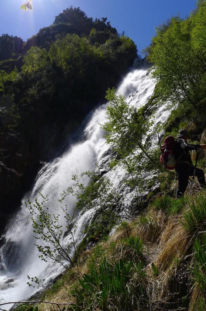 En el descenso paramos un rato en el refugio (2105m 8h04′), ya que conocemos al guarda, Chema Grau. También nos acercamos a la cascada de Espigantosa, por la que cae un caudal enorme, antes de llegar al coche (11h55′).