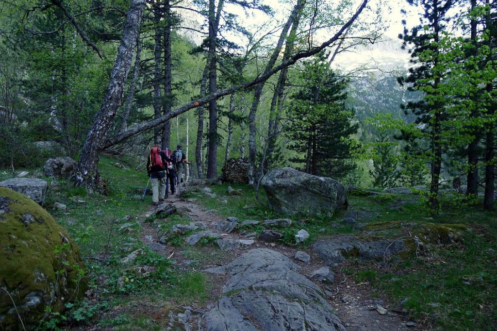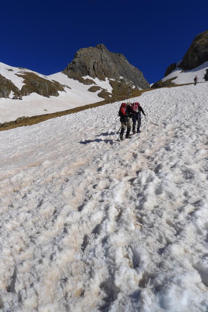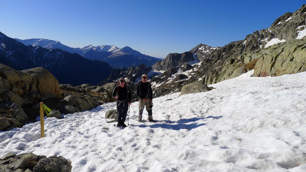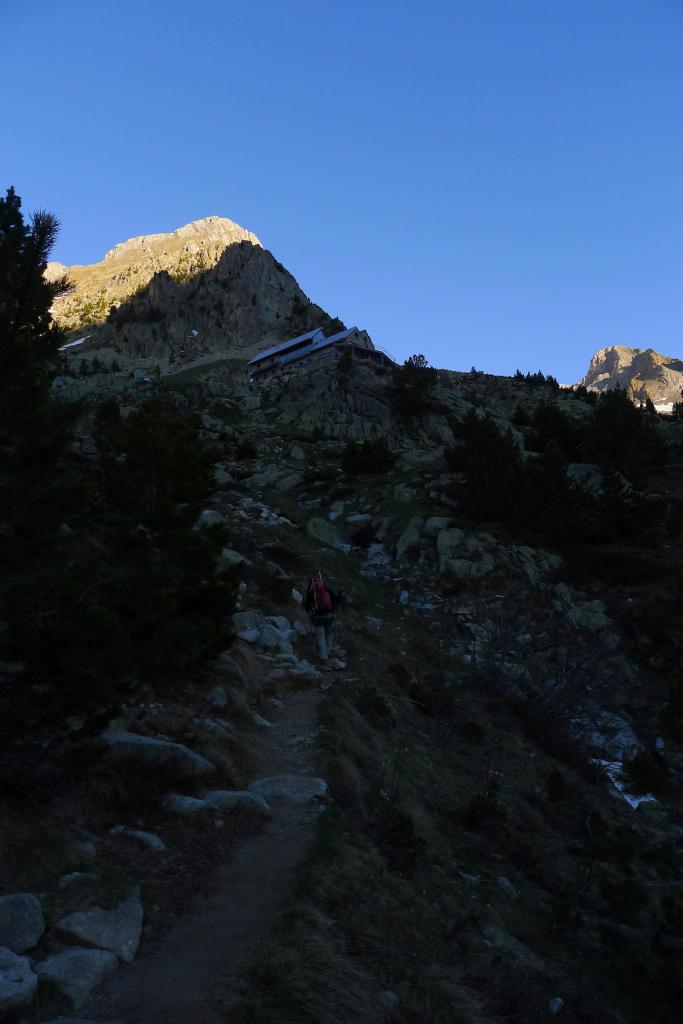 A partir del refugio desaparece el bosque y comienza a dominar el granito. La ruta está bastante señalizada. Se cruza el GR-11 que viene de Viadós y se dirige a Estós (GR-11 2365m 2h10′). Pasamos amplios neveros hacia el NW dirigiéndonos hacia la canal Fonda; la esbelta figura del Diente de Llardana marca el camino, ya que se trata de una canal estrecha a la derecha de esta cumbre rocosa. Si nos fuéramos hacia su izquierda iríamos al Forau de la Neu. (Inicio de la canal Fonda 2665m 3h07′)