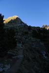 A partir del refugio desaparece el bosque y comienza a dominar el granito. La ruta está bastante señalizada. Se cruza el GR-11 que viene de Viadós y se dirige a Estós (GR-11 2365m 2h10′). Pasamos amplios neveros hacia el NW dirigiéndonos hacia la canal Fonda; la esbelta figura del Diente de Llardana marca el camino, ya que se trata de una canal estrecha a la derecha de esta cumbre rocosa. Si nos fuéramos hacia su izquierda iríamos al Forau de la Neu.(Inicio de la canal Fonda 2665m 3h07′)