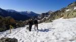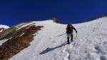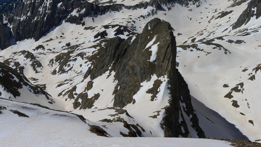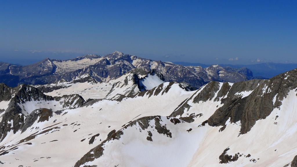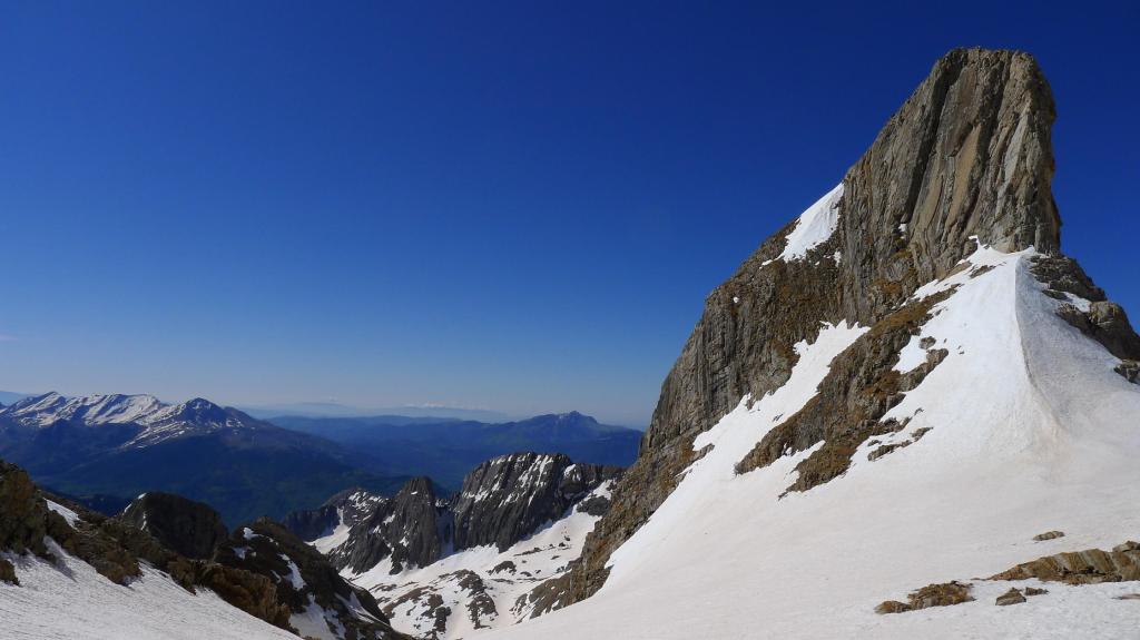 Aquí hay que girar ligeramente a la derecha (N) para acceder a la pala de nieve que se va acercando a la cresta S del Posets. El objetivo va tomando forma, pero esta pala exige un buen esfuerzo. El precioso pico Espadas se perfila a nuestra izquierda y, más lejos, al SW, todo el macizo de Cotiella.