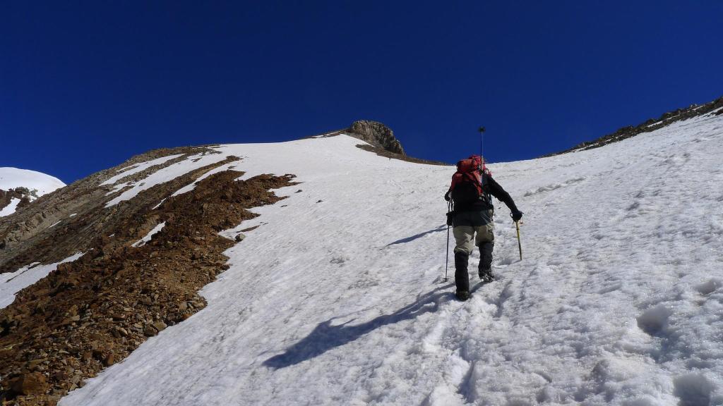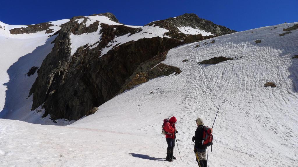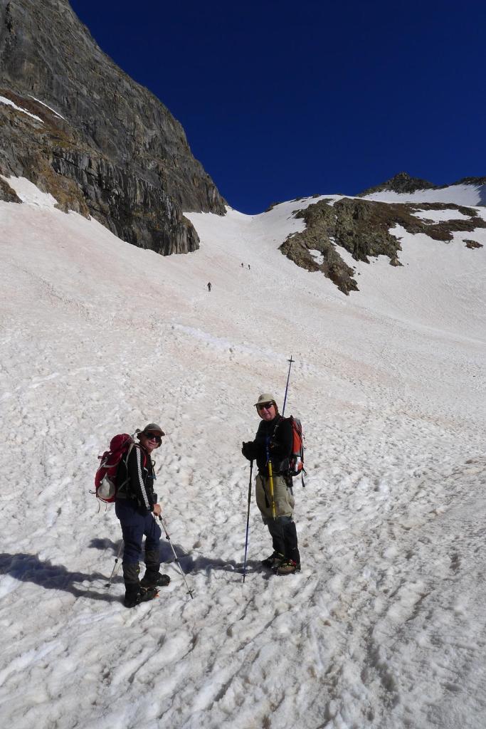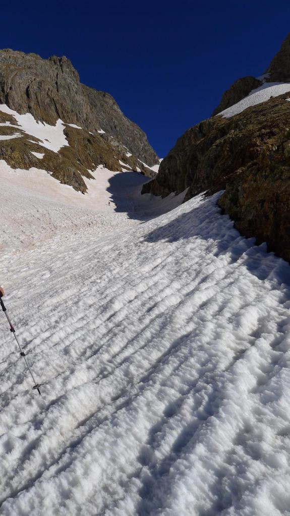 La nieve está dura para cramponear, pero muy irregular en su superficie. El ascenso es lento. La canal Fonda se abre un poco, pero continúa con fuerte pendiente bajo el Diente de Llardana hasta un poco marcado collado (3015m 4h03′).