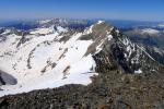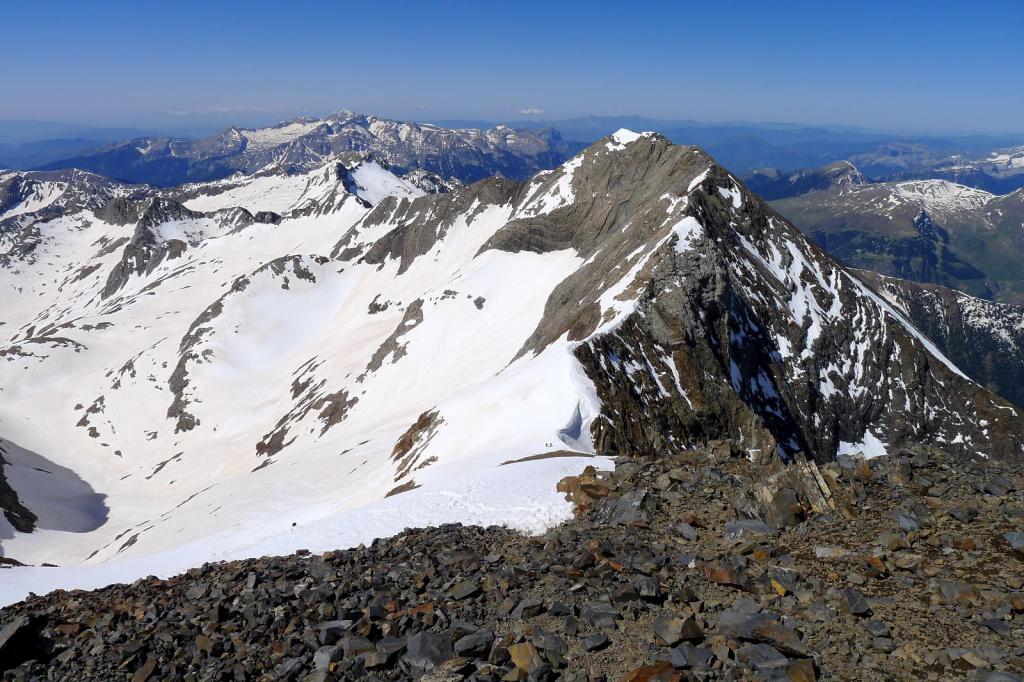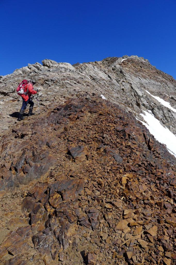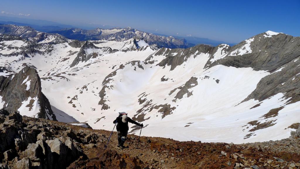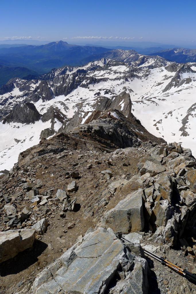 Llegamos a la parte final de la ladera que ya es una pedrera esquistosa y que da paso a la cresta. En la cresta me animo un poco y avivo el paso. No tiene ninguna dificultad y las vistas son espectaculares, con el circo lleno de lagos que se forma entre la sierra de Llardana y la sierra de los Ibones (al SE del Posets) y el macizo de las Maladetas y Aneto, más lejos, al E.