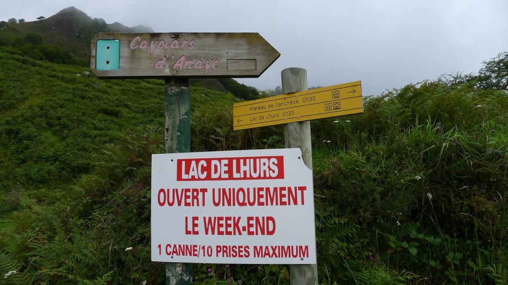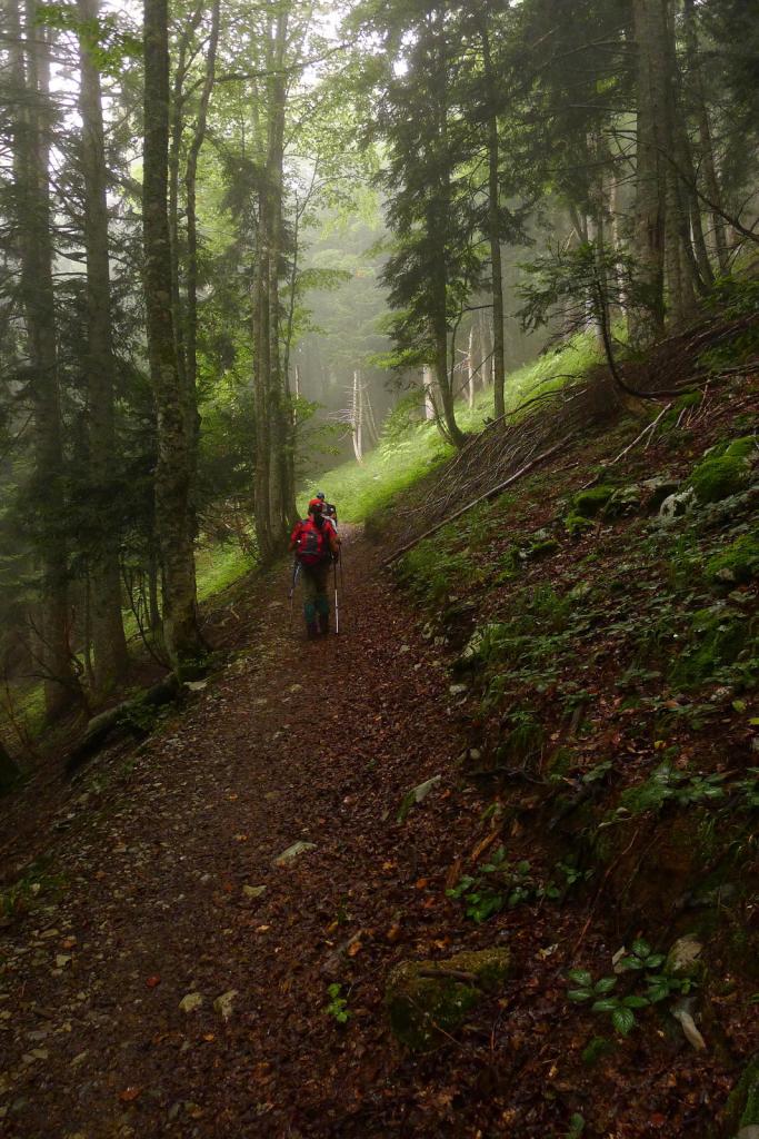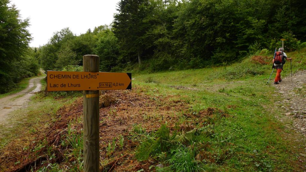 En el aparcamiento de Anapia (1000m) sale la pista, señalizada con carteles, hacia el lac de Lhurs. Un poco más adelante, otro cartel nos hace separarnos de la pista para entrar por una senda a la derecha, internándonos en el bosque de Bresme y Larrangus, un magnífico hayedo envuelto en la niebla. El sendero está bien señalizado. Al salir del bosque veríamos la imponente roca que forma el Deck de Lhurs (ver entrada Lac de Lhurs) si estuviera despejado. Hoy sólo vemos que nos introducimos en un estrechamiento rocoso y que desembocamos en el lac de Lhurs (1690m 1h34′).
