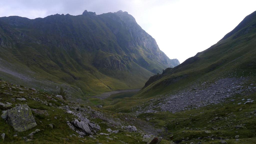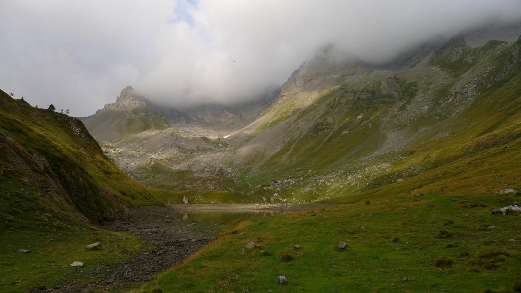 Rodeamos el lago por el N y el O, sin llegar a la cabaña de pastores, dirigiéndonos por la vaguada SSO hasta un laguito (1836m 2h05′) por difusas sendas entre los prados. Después claramente hacia el S al amplio collado entre el Deck (a nuestra izquierda) y las estribaciones de la Mesa de los Tres Reyes (a nuestra derecha).