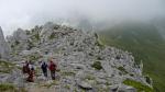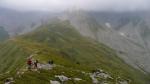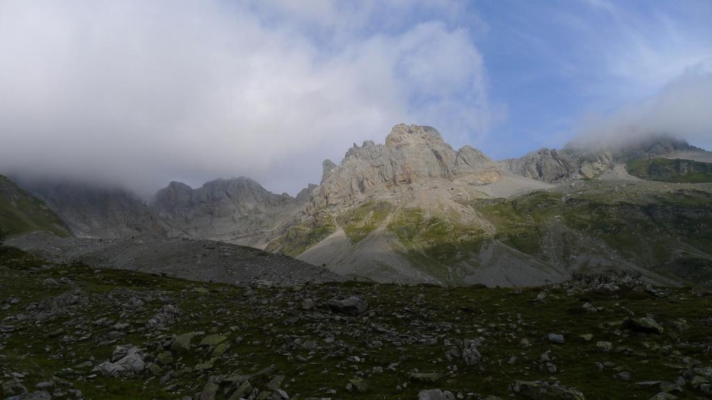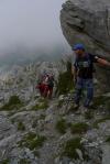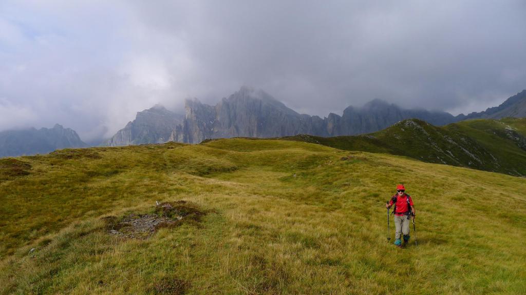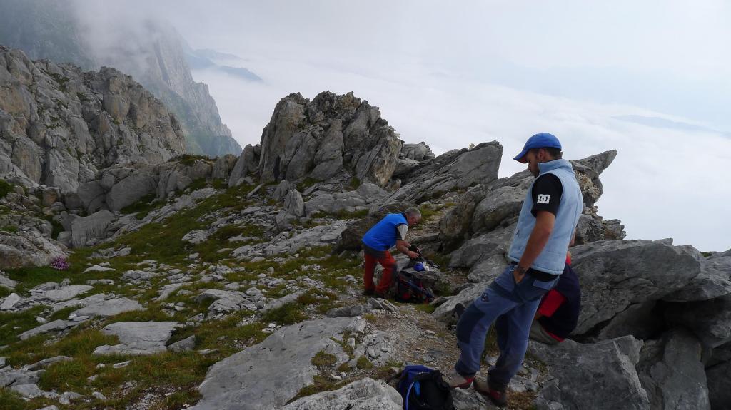 Sin llegar hasta el mismo collado (1960m 2h18′), tomamos el ancho y herboso lomo oeste del Deck que se transforma en rampas rocosas de un caótico karst. Siguiendo hitos y huella de paso, a través de unas chimeneas fáciles, se llega a la cima del Deck de Lhurs (2174m 2h44′), donde las nubes, por encima, y la niebla, por debajo, nos rodean.