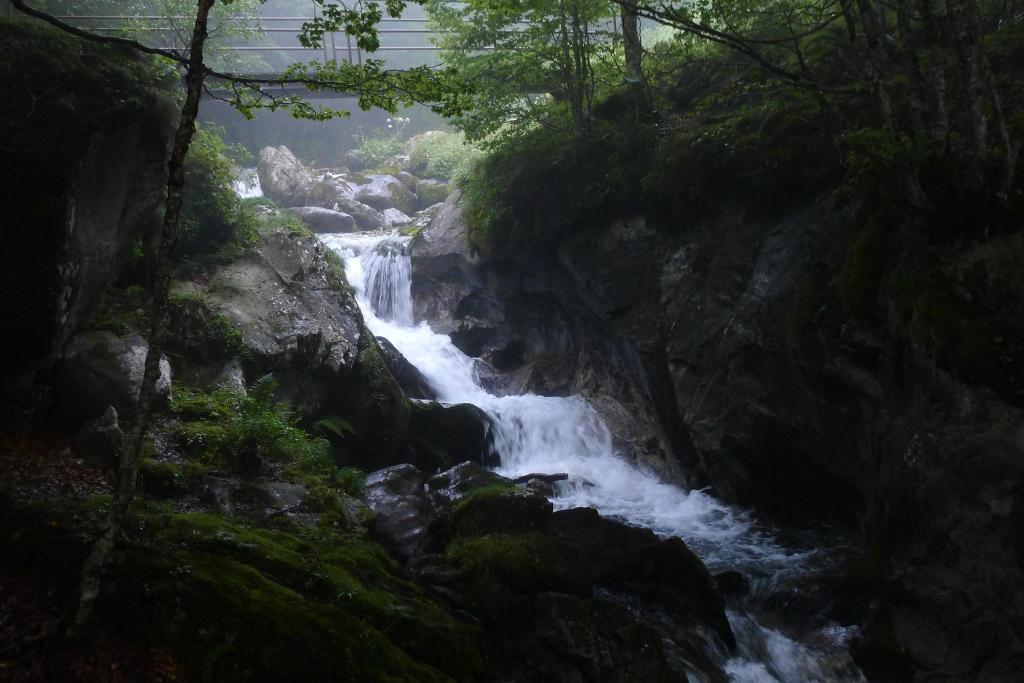 La densa niebla y el frío se apoderan de Gourette, pero espero que vaya despejando más arriba. Paso junto al hotel Boule de Neige, por debajo de dos telesillas y entre dos cercas de ganado, después por un recorrido deportivo (con máquinas para hacer diversos ejercicios) hasta cruzar a la orilla derecha del río Valentin por un puente (1370m 0h07′). Asciendo por el bosque de Saxe siguiendo el GR10 y cruzo definitavente a la orilla izquierda (puente 1450m 0h22′). Un cómodo sendero continúa hasta la cabaña de pastores de Coste de Goua (1670m 0h35′) que queda en la otra orilla.