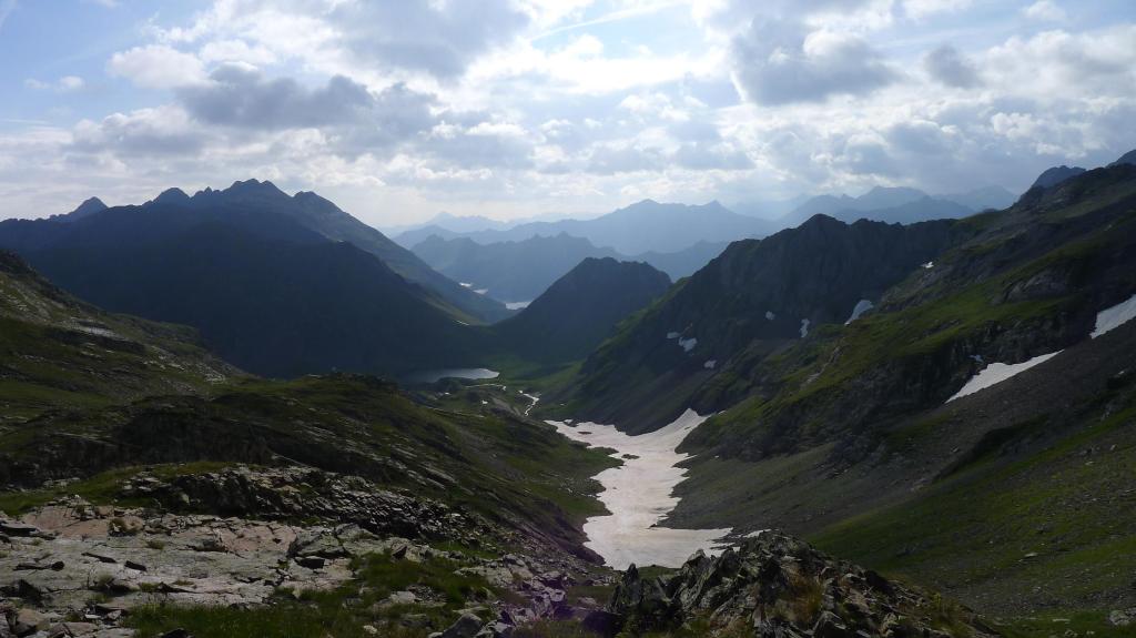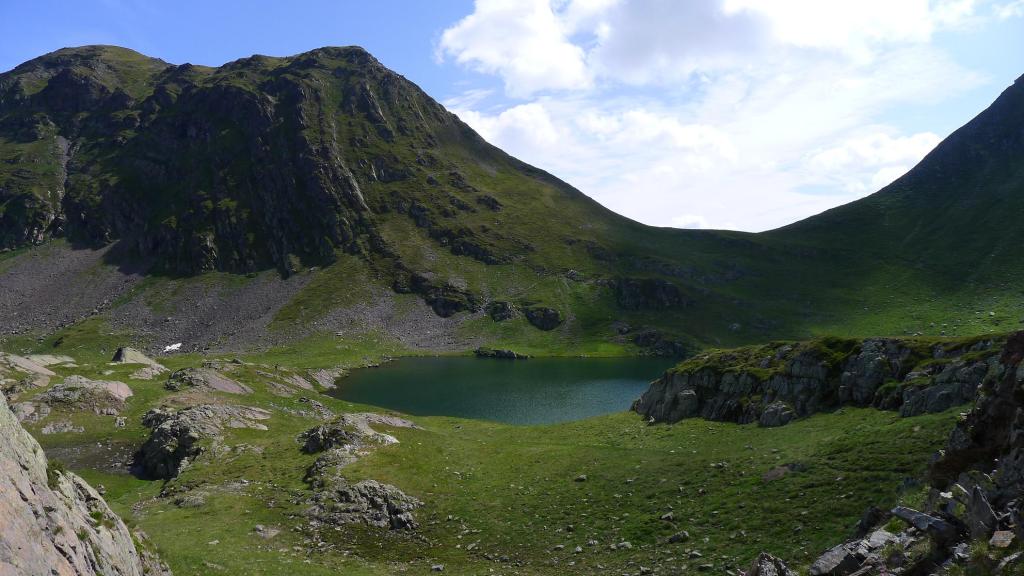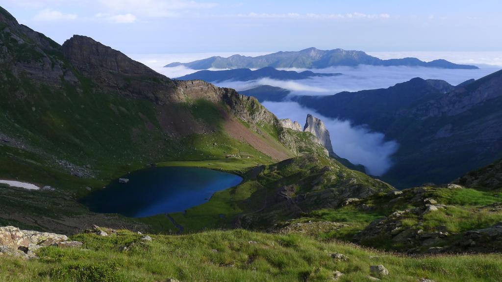 Desciendo hasta la bifurcación al lago Lavedan (2420m 4h17′). El sendero es algo confuso, por prados, pero siguiendo siempre más o menos la vaguada. Paso junto al lago Lavedan (2179m 4h47′) por su izquierda (O) y poco después por el desagüe del lago Uzious (2115m 4h54′). Estos lagos forman una preciosa cubeta glaciar y son frecuentados por pescadores.