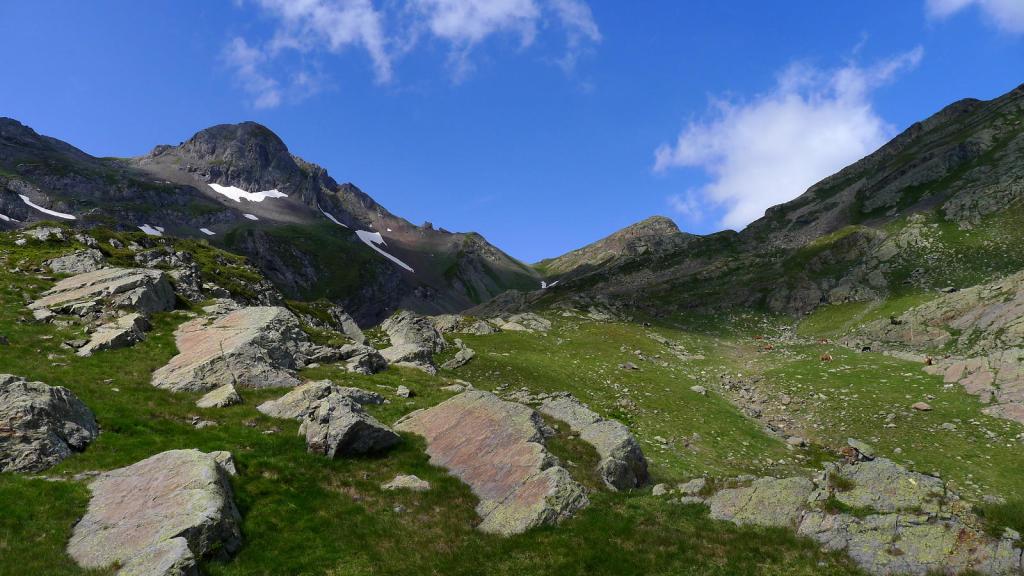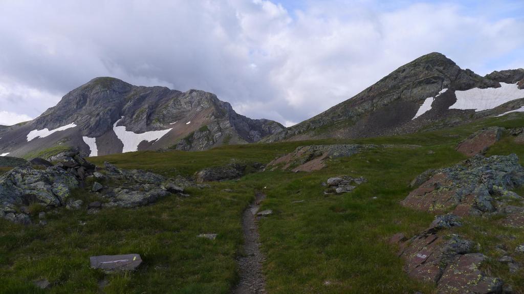Superado el realte rocoso sigo hacia el W y luego hacia el S rodeando el pico de Anglas. Dejo a la izquierda otra bifurcación al lago Lavedan (2420m 2h22′) por donde luego bajaré. Ahora sólo seguiré la marca roja-blanca. Paso junto a una cabaña (2430m 2h24′) y continúo hasta la ya cercana Horquette d’Arre (2465m 2h30′).