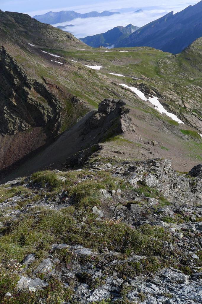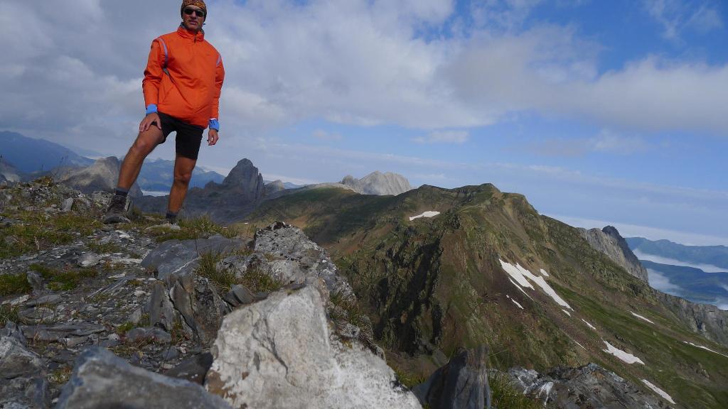 A partir de aquí hay que buscar el recorrido con más cautela. Se afronta la cresta N del Géougue, al principio con tramos herbosos, se evita un mogote rocoso por la derecha (O) ascendiendo de nuevo a la cresta por una vira pelada de piedrilla. Se evitan dos gendarmes de nuevo por la derecha. Se sigue la cresta por una zona rocosa con alguna placa en la que hay que apoyar las manos hasta que, en la cota 2599m, se gira a la izquierda para seguir el tramo de cresta occidental, más recortada. En este tramo se avanza a plena cresta o un poco por la ladera S (derecha) que es la menos vertical, hasta la cumbre (Géougue d’Arre 2619m 2h56′)