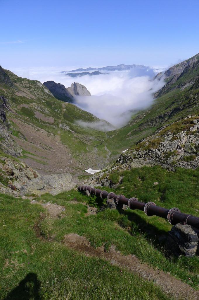 Se atraviesa el desagüe a la orilla izquierda y se desciende junto a una tubería por una empinada senda que pasa de un lado a otro de dicha tubería y deja a la derecha una espectacular cascada. Se llega así al valle y se conecta de nuevo con el GR10 para continuar hasta Gourette (6h08′)