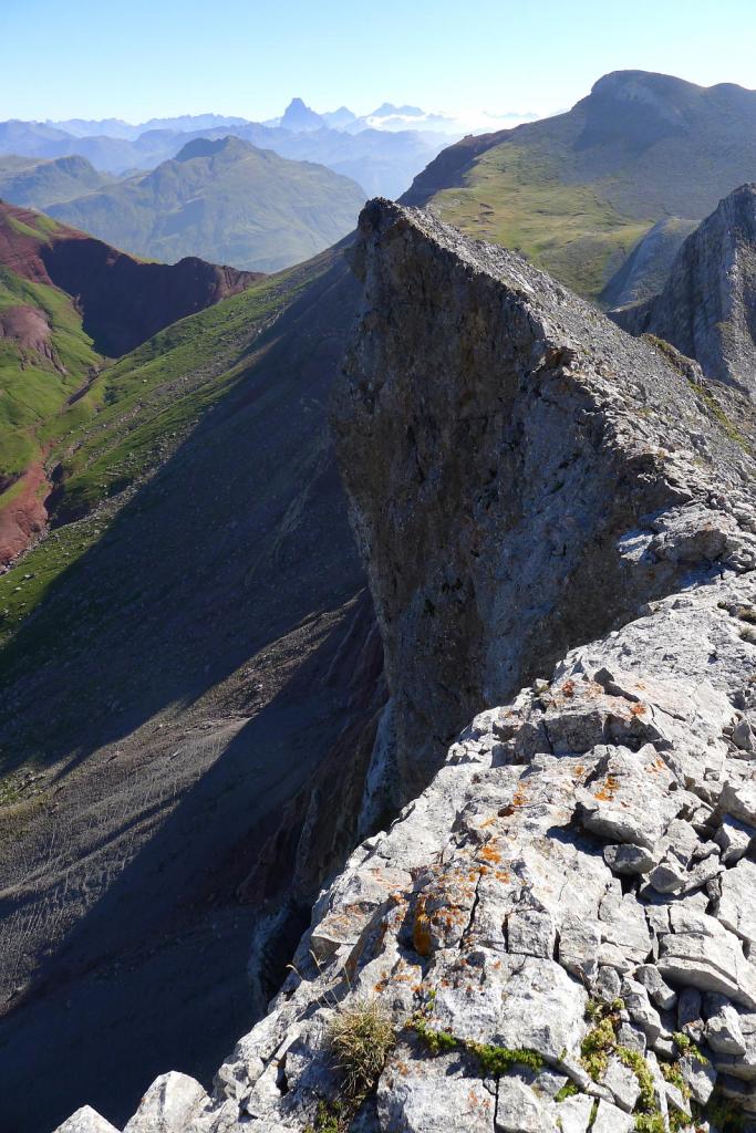 Desciendo más o menos por el mismo camino hasta la parte S del collado (2260m 3h07′). Asciendo la cota del collado (2282m), desciendo a la parte N del collado de Costatiza (2214m) y trato de visualizar una ruta hacia el puerto de Taxera para pasar a la cima de Secús, pero lo que veo es un canchal muy pendiente y Secús demasiado lejos. Lo dejaré para otra excursión y ahora subo hasta la cima de Costatiza (2322m 3h32′) por una ladera bastante pendiente, pero fácil. Recorro un poco hacia el E la cresta, cuya caída hacia el N es espectacular, da vértigo asomarse, y vuelvo al collado N (2214m), la cota 2282m (4h01′), el collado S (2260m) y el regreso por la misma ruta hasta el campamento (5h53′)