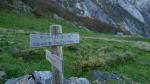 Enseguida dejo la senda (1720m) y tomo dirección SE por la ladera de hierba hasta encontrar una sendita hacia el S (1870m 1h44′), bajo la cresta del col d’Iseye al Permayou. La senda se introduce en la parte más complicada de la ruta, un karst muy roto, lleno de grietas y simas. Al principio hay algún hito, pero luego los pierdo y voy ascendiendo hacia el SE, saliendo del karst hacia las laderas de hierba que, con mucha pendiente pero sin complicaciones, se dirigen a la cresta. Subo por hierba, a la derecha de una pedrera.