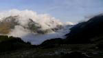 Salimos del pueblo de Senet (1300m) por la señalizada ruta de la fauna, a través de un camino bien acondicionado entre bojes, avellanos, pinos y acebos, balizado con postes con pintura azul. Llegamos a un abrevadero (1380m 0h17′) y empezamos a ascender por prados vaqueros. El valle, por debajo de nosotros, está oculto por la niebla. Varias veces coincidimos con la pista ganadera que sube por nuestra izquierda, hasta que enfilamos dirección S, paralelos a la pista, para llegar al refugio Artigalonga (1715m 1h00′), que está cerrado.