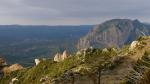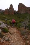 Salimos de Riglos (630m) por el GR1 dirección SE. Lo dejamos para tomar la senda circular (700m 0h24′) que asciende hacia el N, balizada con pintura azul, hasta un collado a la derecha del mallo Colorado (920m 1h00′). Decenas de buitres sobrevuelan vigilantes los mallos. El camino continúa a la derecha de los mallos hasta otro collado más amplio (1019 1h15′) donde dejamos la senda circular para ir a la dercha (E) junto al refugio Roseta. Ascendiendo suavemente al collado Espinabla (110m 1h47′) conectamos con una pista.
