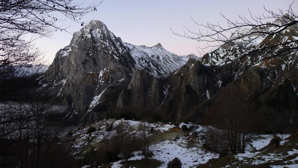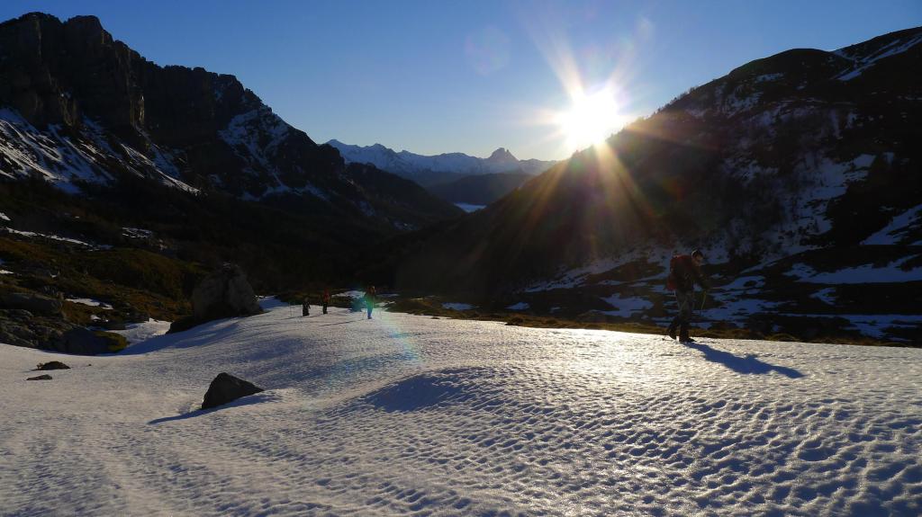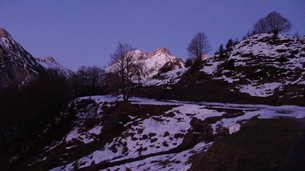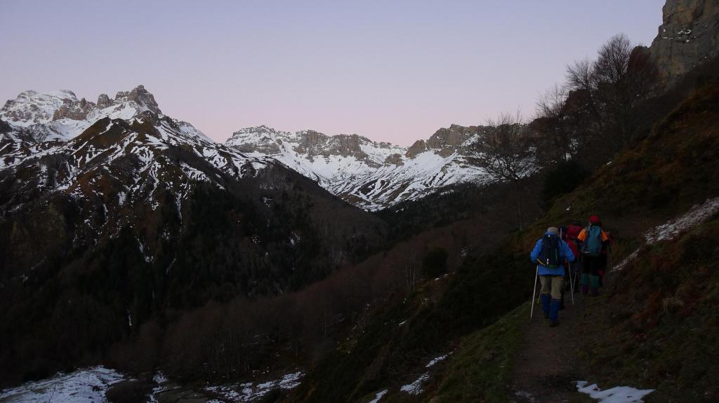 Con Ricardo y Agustín Arnáiz, José Murciano, Marcos y Javier Galindo, salimos del refugio de Laberouat, al que se accede por una de las estrechas carreteritas que recorren el circo de Lescun, bien señalizadas desde el pueblo de Lescun y, por lo visto, mantenidas, porque la nieve está apilada a la orilla de la carretera. Dejamos las raquetas en el coche, porque hasta la nieve queda mucho trozo y parece que estará muy dura, y disfrutamos de una vista bellísima con los primeros resplandores del amanecer sobre un mar de nubes que cubre el valle.
