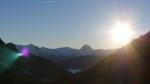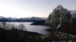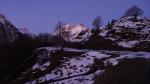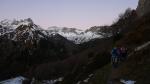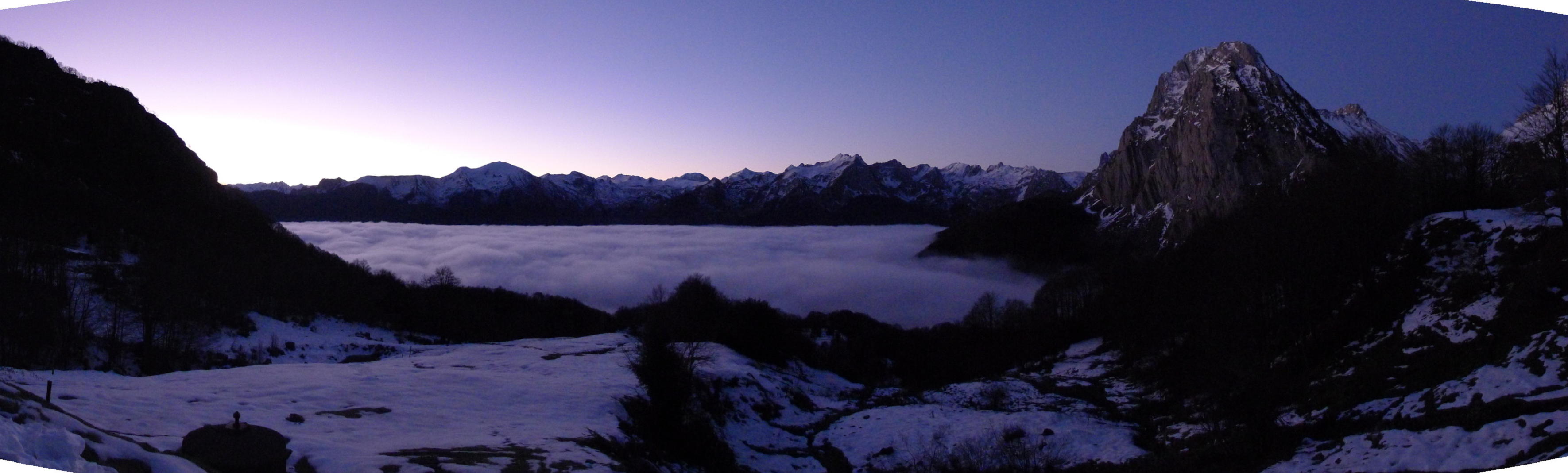 Con Ricardo Agustín Arnáiz, José Murciano, Marcos y Javier Galindo, salimos del refugio de Laberouat, al que se accede por una de las estrechas carreteritas que recorren el circo de Lescun, bien señalizadas desde el pueblo de Lescun y, por lo visto, mantenidas, porque la nieve está apilada a la orilla de la carretera. Dejamos las raquetas en el coche, porque hasta la nieve queda mucho trozo y parece que estará muy dura, y disfrutamos de una vista bellísima con los primeros resplandores del amanecer sobre un mar de nubes que cubre el valle.