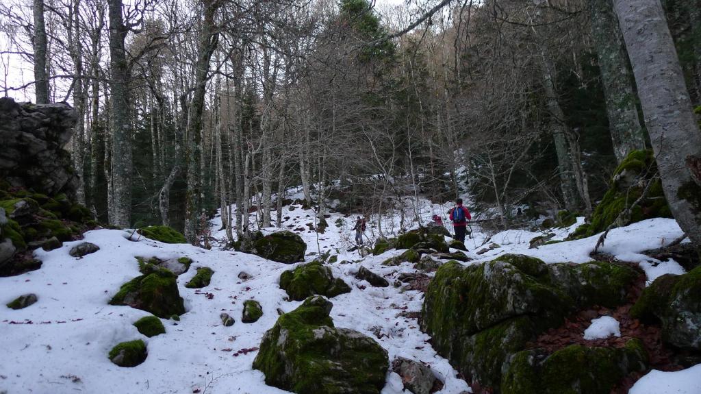 De Laberouat (1435m) parte el GR10 hacia la Pierre St.Martin por una senda bajo el magnífico hayedo-abetal, con el imponente Billare a nuestra izquierda y las paredes de les Orgues de Camplong a nuestra derecha y algunos tramos nevados. Apenas se gana desnivel, incluso hay pequeños descensos.