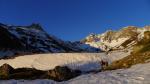 Se llega a una hondonada que corresponde al lac d’Anie (2042m) pero que ahora no se distingue, cubierto de nieve. Aún se pueden ver algunos hitos que nos marcan la dirección a seguir, hacia el S y con la pared del Countendé a nuestra izquierda. Alcanzamos así un montículo con una cruz (2210m 2h45′). Nos ha retrasado un poco apañar los crampones de Galindo, que no encajan bien en sus botas, y toma la decisión de quedarse aquí porque lo que viene son pendientes más fuertes y con nieve muy dura.