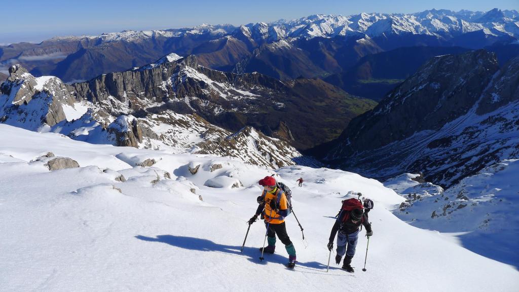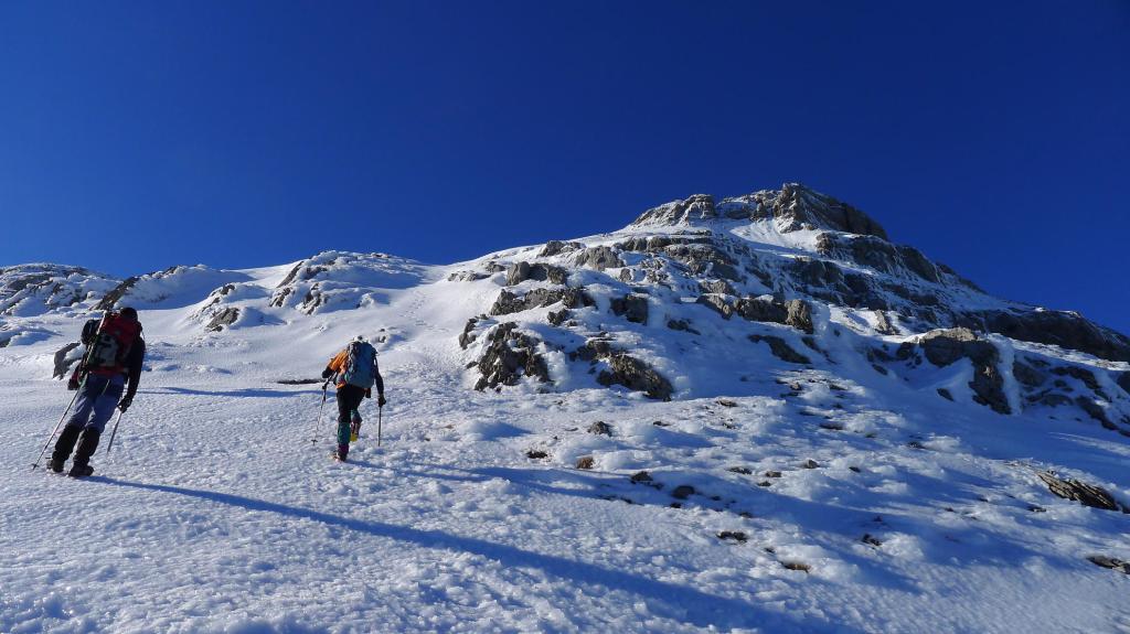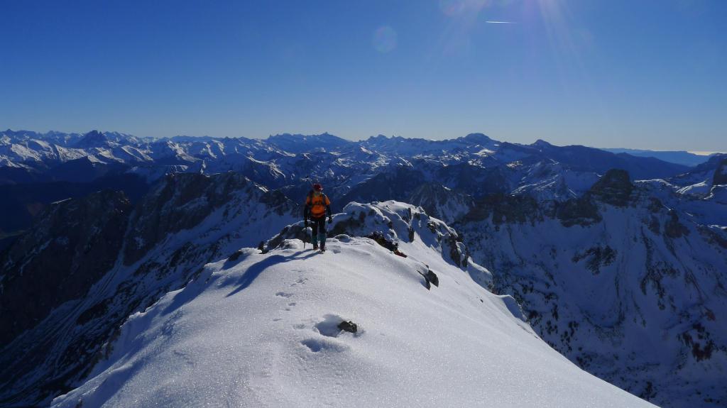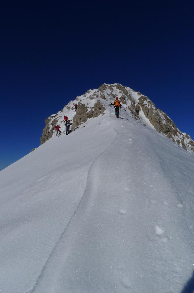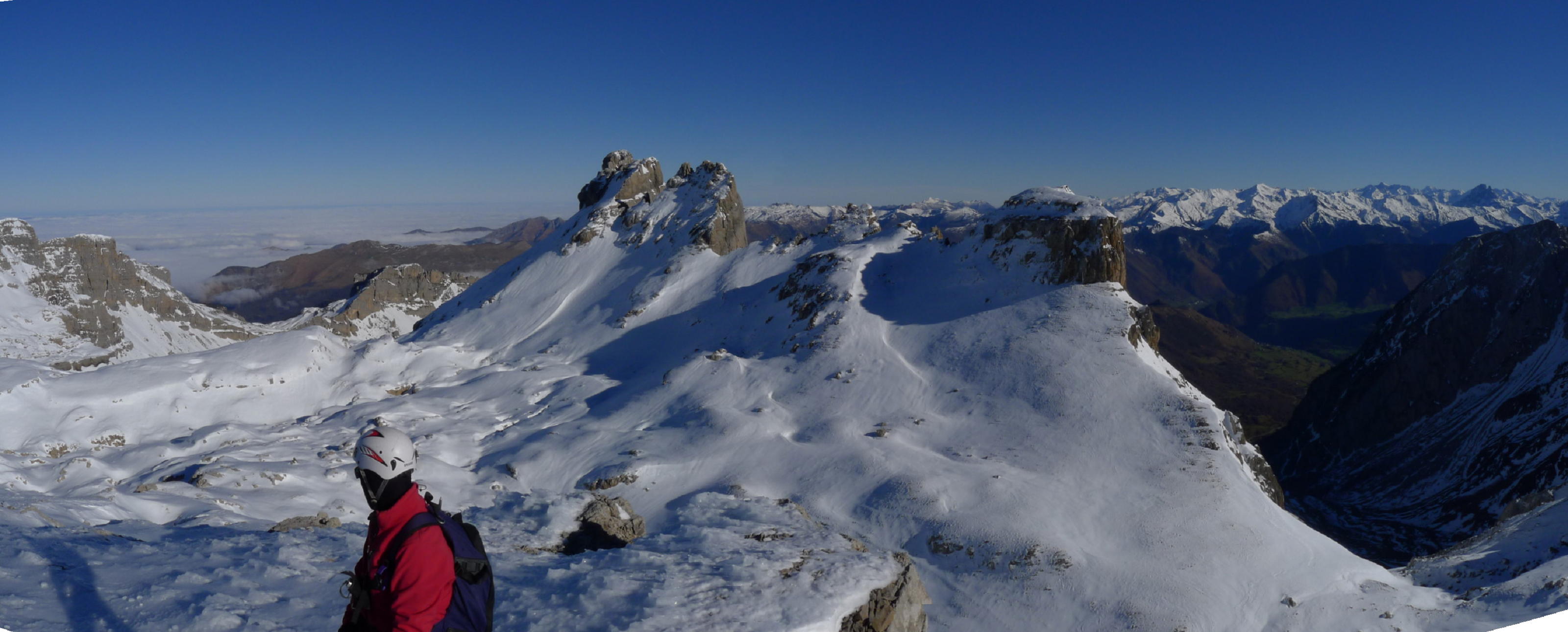 Avanzamos por la ladera NE del Anie hasta alcanzar su cresta SE. La cresta, al principio sin mucha pendiente, desemboca en un paso rocoso que se esquiva por la izquierda para afrontar un pequeño corredor bastante vertical, pero con nieve más blanda, que nos deja prácticamente en la cima (Anie 2504m 3h43′). Con el precioso día soleado que tenemos, la vista es espléndida. Hay un viento frío, pero se puede soportar.