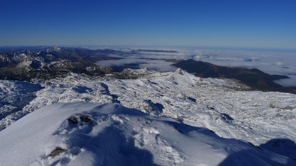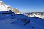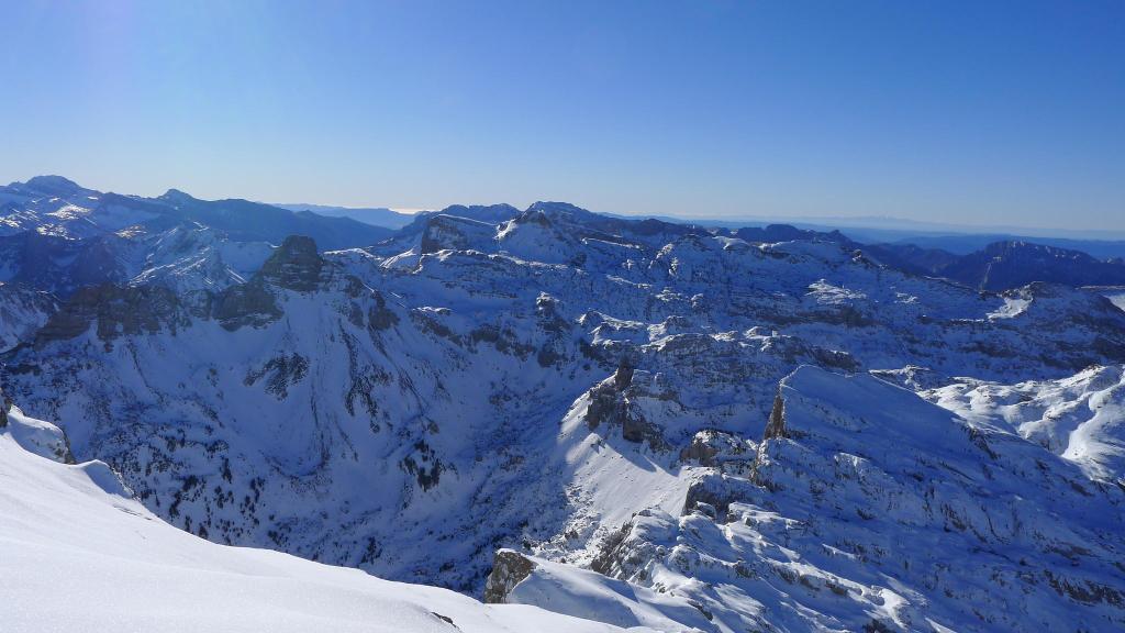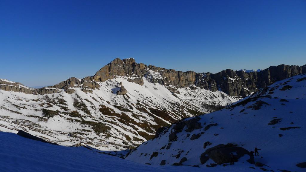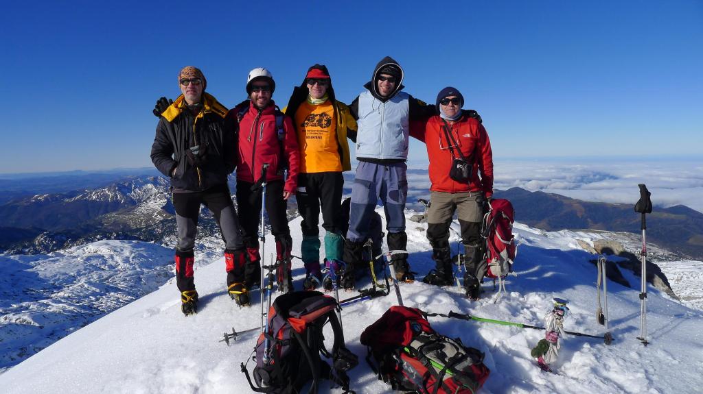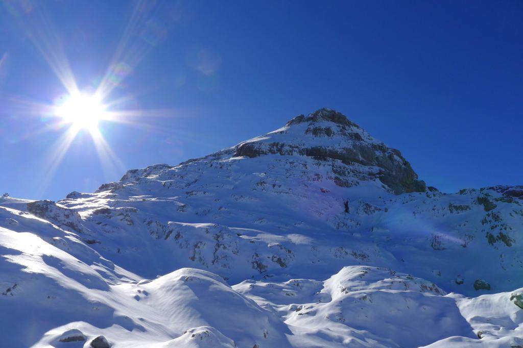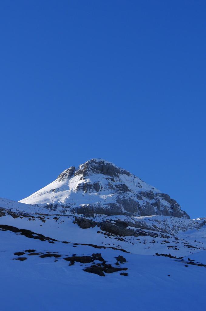 Avanzamos por la ladera NE del Anie hasta alcanzar su cresta SE. La cresta, al principio sin mucha pendiente, desemboca en un paso rocoso que se esquiva por la izquierda para afrontar un pequeño corredor bastante vertical, pero con nieve más blanda, que nos deja prácticamente en la cima (Anie 2504m 3h43′). Con el precioso día soleado que tenemos, la vista es espléndida. Hay un viento frío, pero se puede soportar.