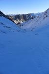 Al salir del bosque a zona abierta encontramos la cabaña d’Ardinet (1570m 0h53′). Al SW tenemos la principal referencia de la ruta, el pic de Countendé, que hay que ir bordeando por su cara occidental. Seguimos hacia el oeste hasta la siguiente cabaña de pastores, cabaña de Cap de la Baitch (1690m 1h15), donde el GR10 se desvía a la derecha (N) al Pas d’Azuns, mientras nosotros giramos hacia el SW y S por unas vaguadas que nos acercan al Countendé. La nieve ya es continua y dura y calzamos crampones.