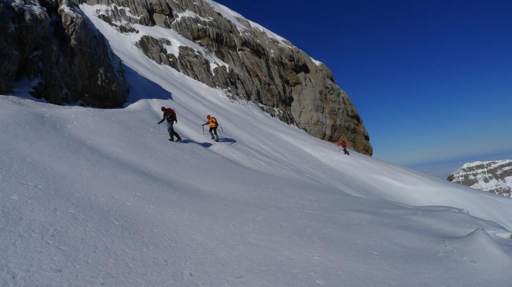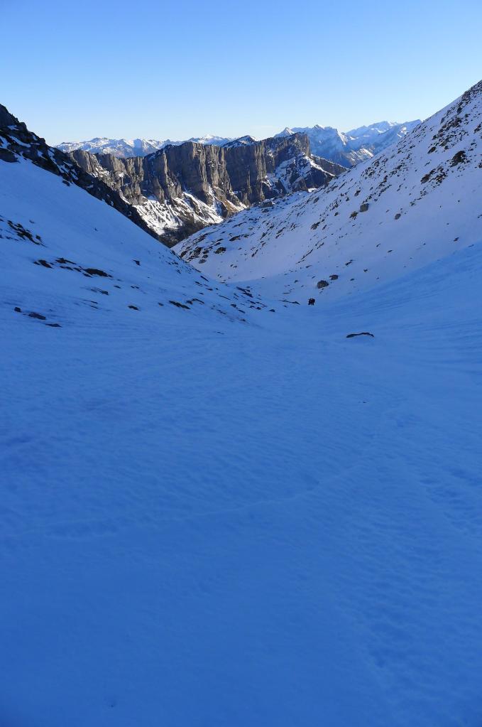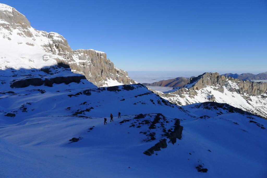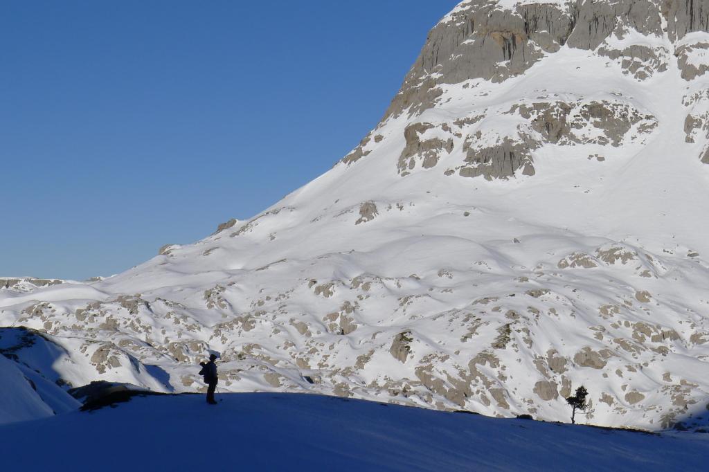 El terreno es caótico ya que corresponde a un imponente karst. Tenemos que llegar al collado entre el Anie y el Countendé y, para ello, hay que rodear una gran hondonada. Ahora lo hacemos por la derecha (por el oeste) y a la vuelta lo haremos por el E, de forma algo más directa. Las medias laderas son delicadas, apenas clavando las puntas de los crampones que casi no dejan huella en la nieve helada; a veces está cristalizada y al pisar se fragmenta en trozos de hielo. Pero todo compensa con la grandiosidad de este paisaje blanco.