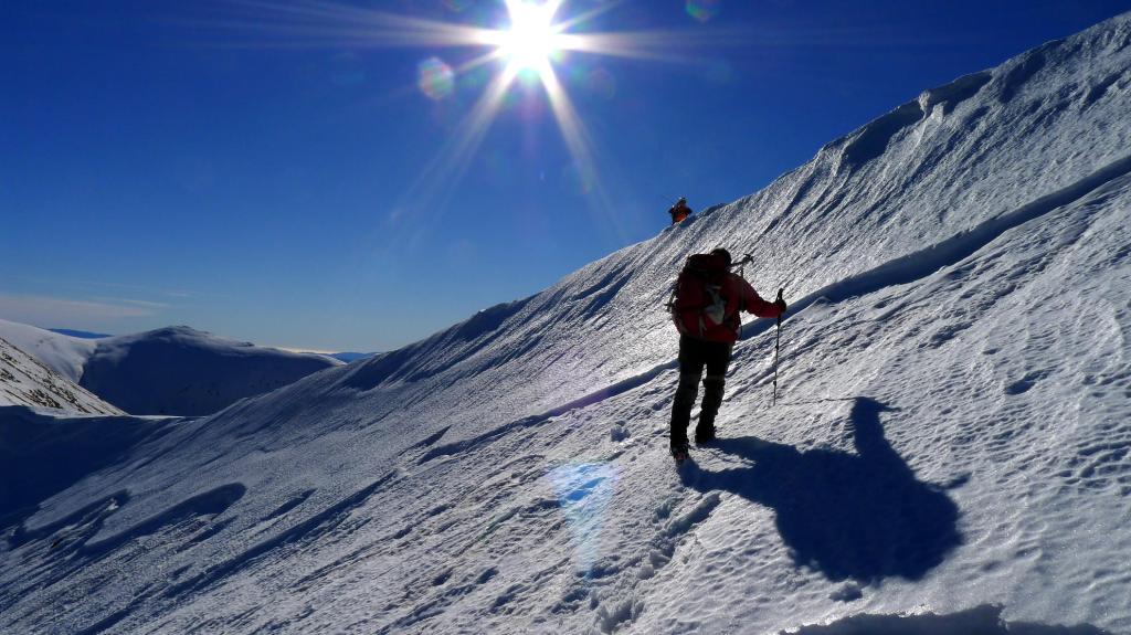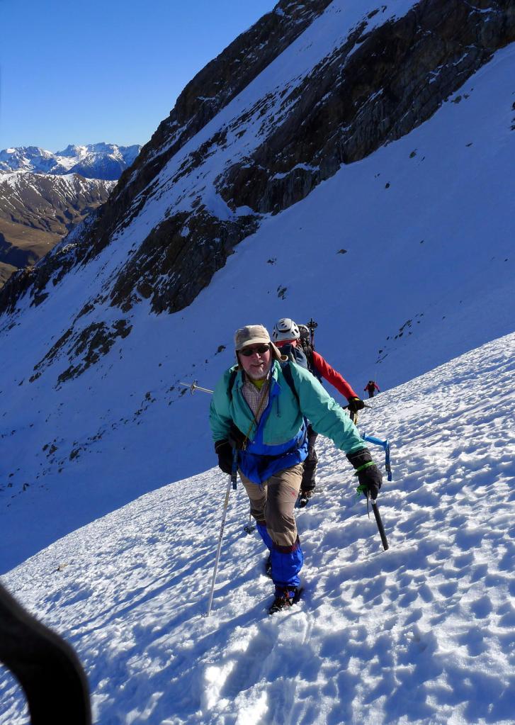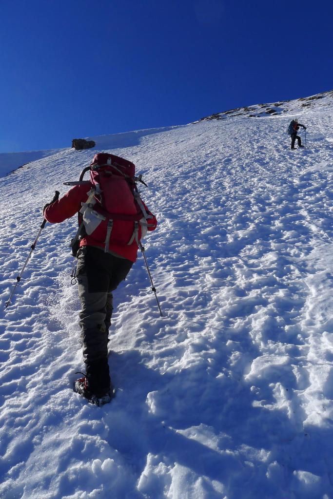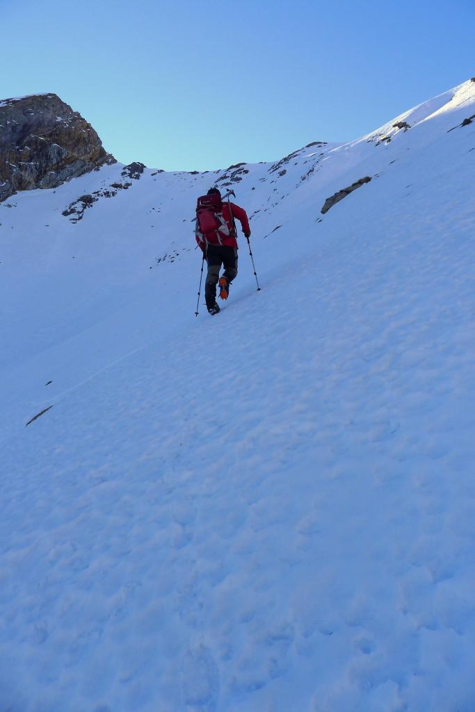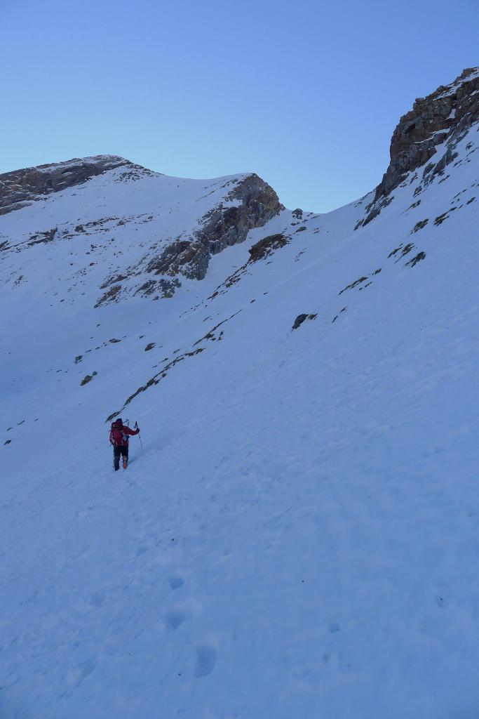En la cara E de la montaña vamos girando a la derecha (S) haciendo una media ladera casi sin perder altura. Nos ponemos los crampones y avanzamos en horizontal por ladera de pendiente bastante fuerte a unos 2300m, por encima del ibón de Basibé. Encaramos la primera vaguada a la derecha (S), la canal de la Obaga, y subimos bastante directos al principio, luego hacemos un zigzag hacia el oeste, y de nuevo al S hasta el collado que forman la Tuca de Basibé y la Pala del Estany (2575m 2h35′). La nieve está muy cambiante, a veces dura, a veces nos hundimos, a veces costra. La pendiente es dura y requiere toda la atención para evitar caídas.