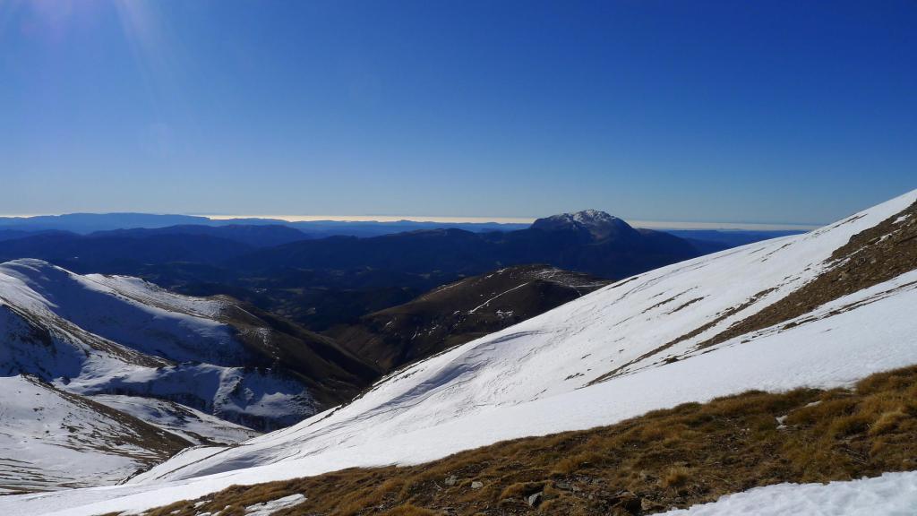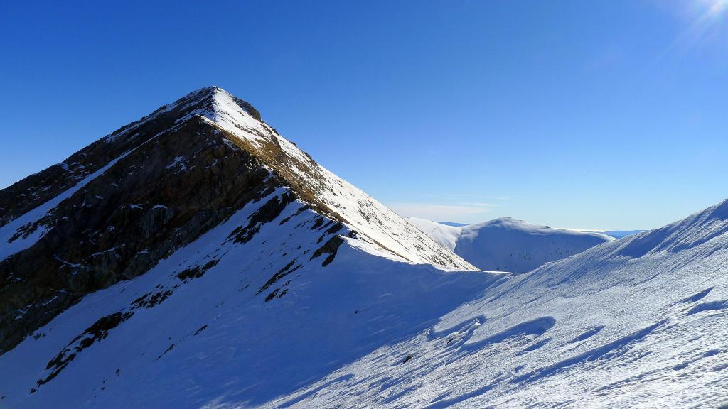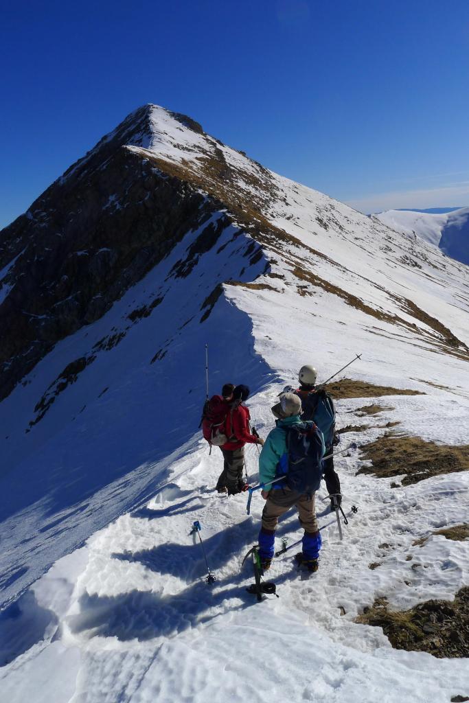 Cuando en las zonas bajas tenemos unas densas nieblas, aquí en la montaña disfrutamos de un fantástico tiempo. Salimos del aparcamiento del Ampriú (1915m), subiendo junto al barranco que baja desde el collado de Basibé y a la izquierda de las pilonas del telesilla (SE). Hay muy poca nieve y subimos sin crampones hasta un poco a la derecha del collado de Basibé (2287m 1h07′).