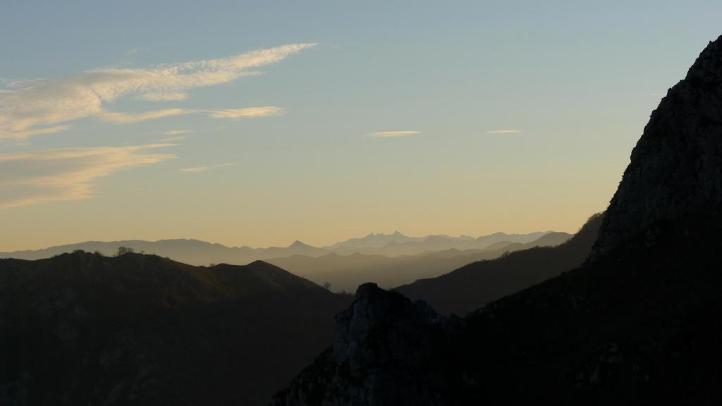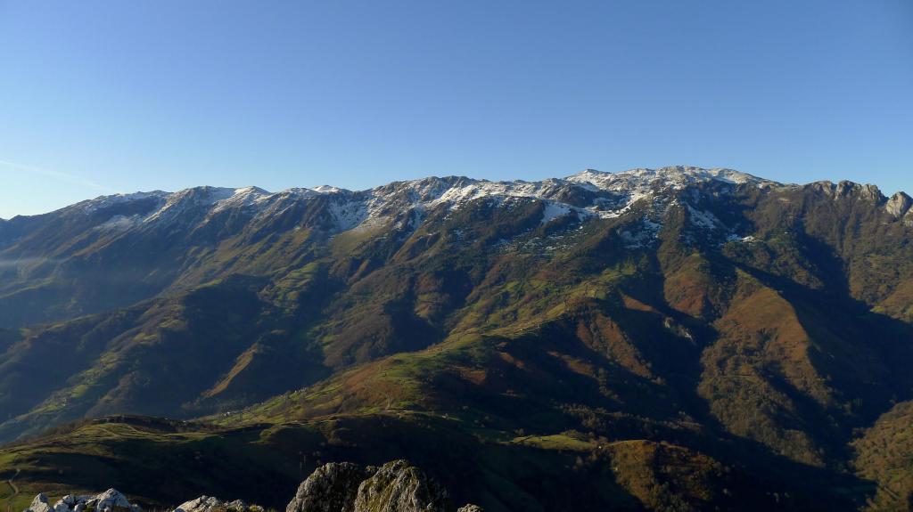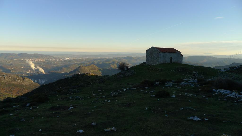 Junto con Luigi Toffolatti vamos a ascender por la cara norte y descender por la cara sur. Nada más pasar el pueblo de La Collada (390m) a menos de media hora de Oviedo, hay un ensanchamiento para aparcar algún coche y unos carteles nos indican el evidente camino de subida . En un bosque de castaños nos elevamos suavemente hacia el oeste. Al pasar bajo la línea de alta tensión comenzamos a subir en zigzag por la ladera en dirección S (junto a línea eléctrica), hasta llegar a una zona de prados, donde se desdibuja el camino, pero que rápidamente llega a la zona llamada la silla del obispo, una hondonada en cuyos extremos se encuentran la ermita de la Magdalena (856m 0h55′) y la ermita de Santiago que dejamos a nuestra izquierda pasando un poco por encima (932m 1h10′).